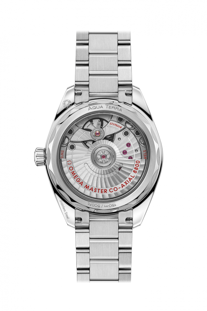 Omega Seamaster Aqua Terra 150M In-house calibre, 34 mm. Die Uhr hat folgende Funktionen: Lumineszenz und Datum . Die Grundparameter der Uhr sind: bewegungsart ist mechanische Uhr mit automatischem Aufzug, armbandmaterial ist Stahl, wasserabweisend ist 150 m und ziffernblattfarbe ist rosa.