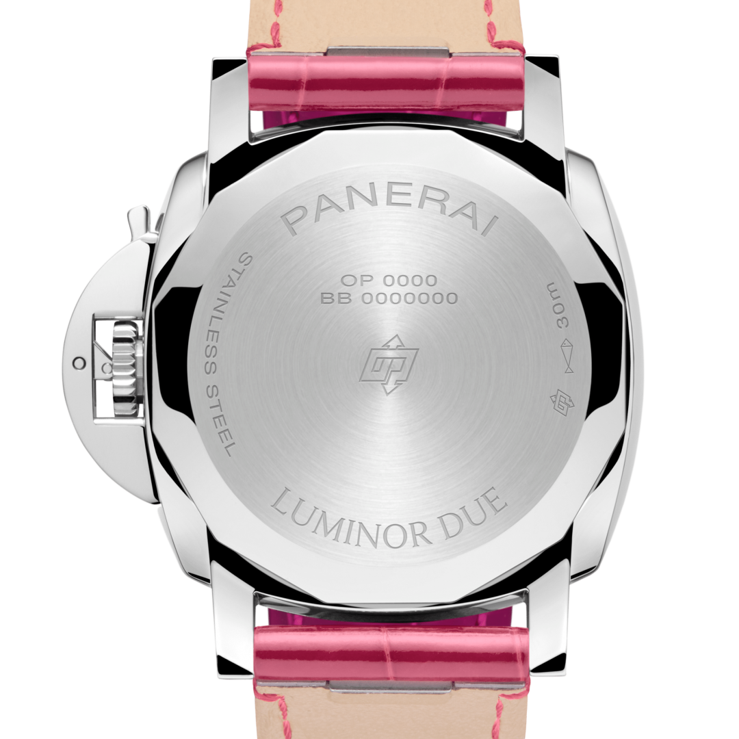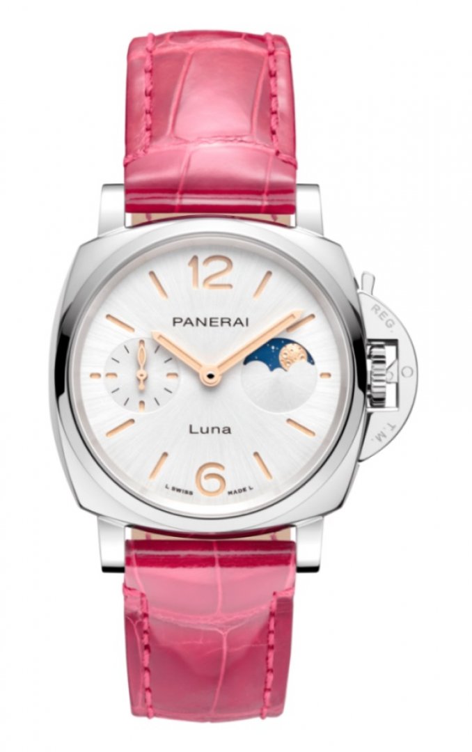 Panerai Luminor Due Luna Moon Phase, Automatik, 38 mm. Die Uhr hat folgende Funktionen: Lumineszenz und Mondphasen. Die Grundparameter der Uhr sind: bewegungsart ist mechanische Uhr mit automatischem Aufzug, armbandmaterial ist Leder, wasserabweisend ist 30 m und ziffernblattfarbe ist silbern.