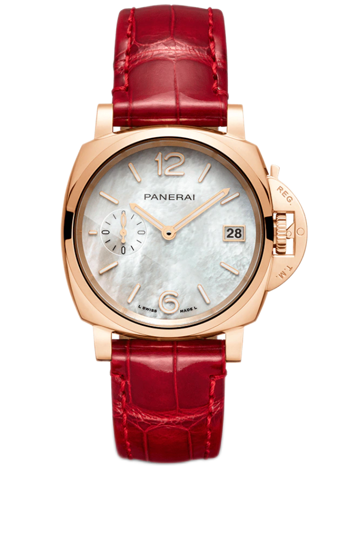 Panerai Luminor Due Goldtech™ Madreperla Gold, Manufaktur kaliber, 38 mm. Die Uhr hat folgende Funktionen: Lumineszenz und Datum . Die Grundparameter der Uhr sind: bewegungsart ist mechanische Uhr mit automatischem Aufzug, armbandmaterial ist Leder, wasserabweisend ist 30 m und ziffernblattfarbe ist perlmuttern.