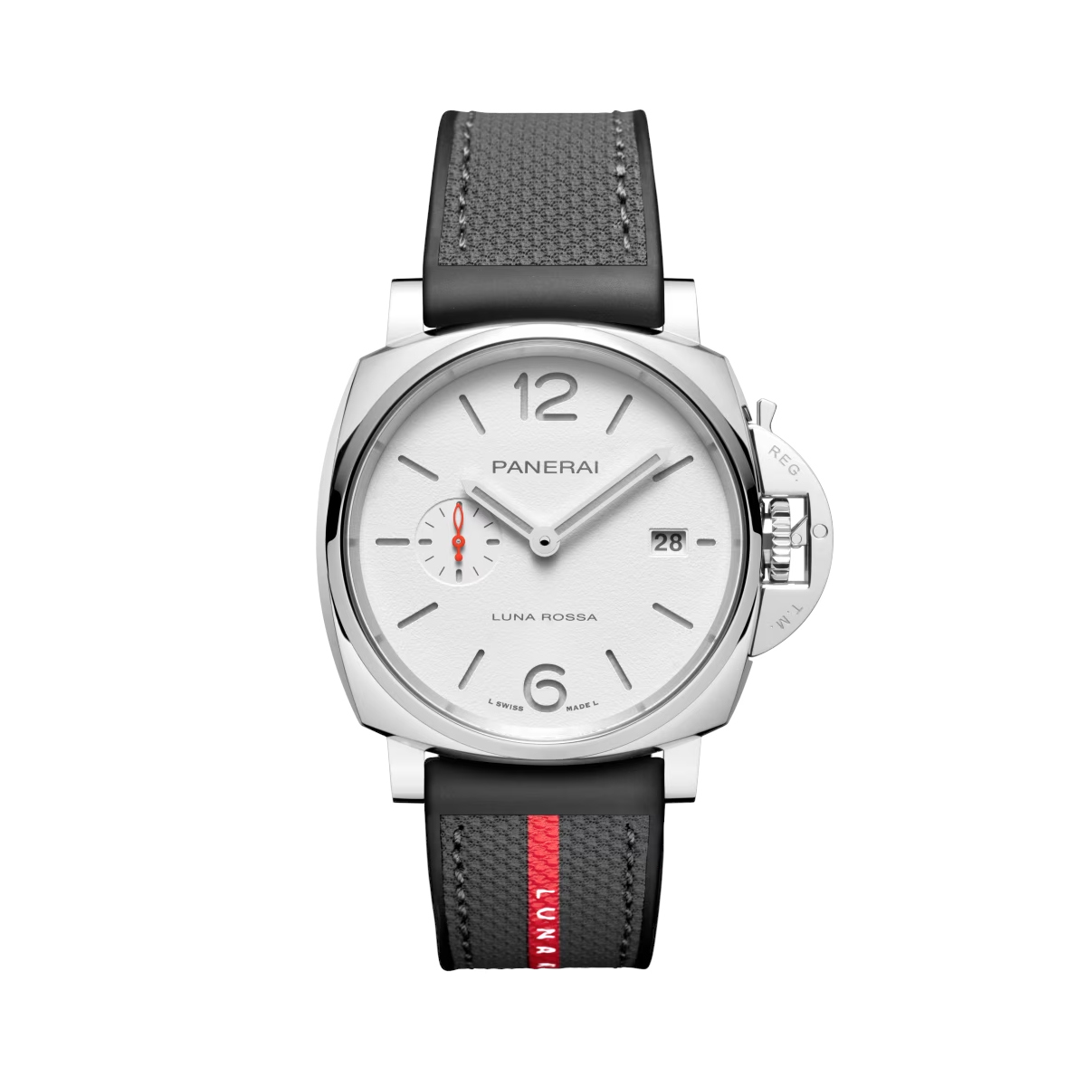 Panerai Luminor Due Luna Rossa In-house calibre, 42 mm. Die Uhr hat folgende Funktionen: Lumineszenz und Datum . Die Grundparameter der Uhr sind: bewegungsart ist mechanische Uhr mit automatischem Aufzug, wasserabweisend ist 30 m, ziffernblattfarbe ist weiß und armbandmaterial ist Gummi.