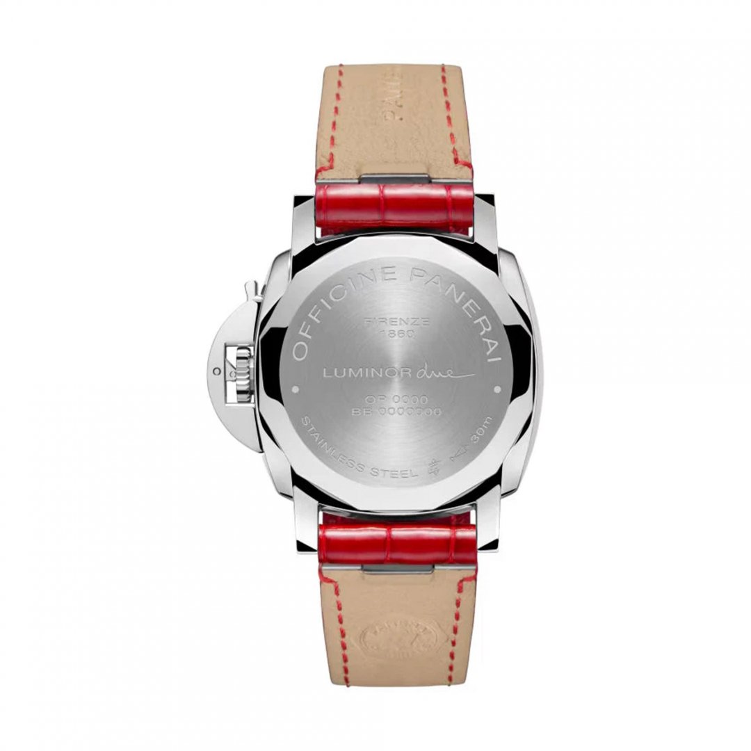 Panerai Luminor Due In-House movement, Automatik, 38 mm. Die Uhr hat folgende Funktionen: Lumineszenz und Datum . Die Grundparameter der Uhr sind: bewegungsart ist mechanische Uhr mit automatischem Aufzug, armbandmaterial ist Leder, wasserabweisend ist 50 m und ziffernblattfarbe ist beige.
