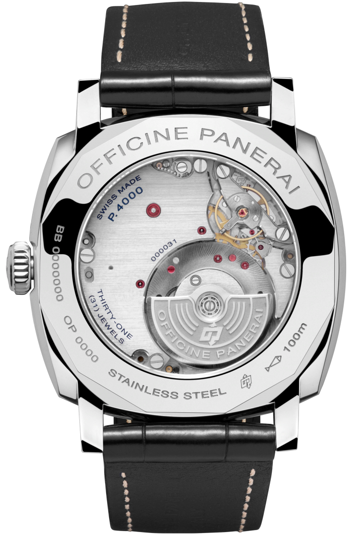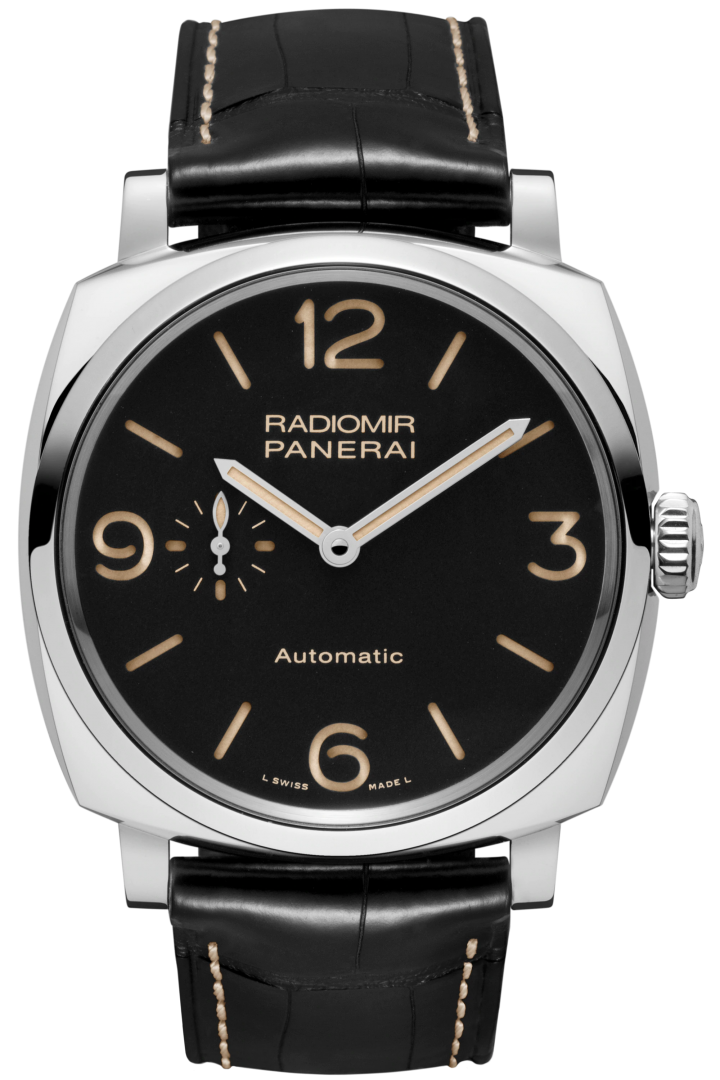 Panerai Radiomir . Die Uhr hat folgende Funktionen: Lumineszenz. Die Grundparameter der Uhr sind: ziffernblattfarbe ist schwarz, bewegungsart ist mechanische Uhr mit automatischem Aufzug, armbandmaterial ist Leder und wasserabweisend ist 100 m.