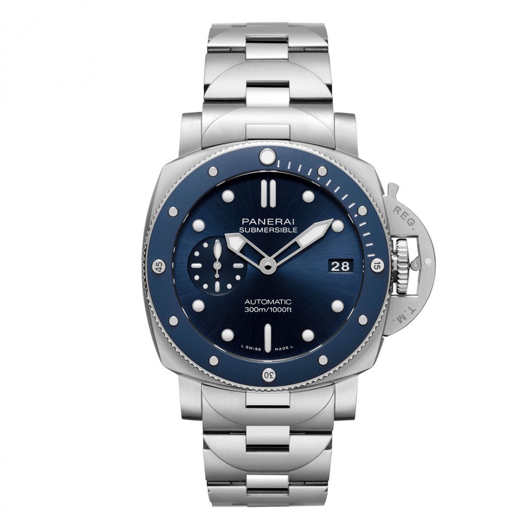 Panerai Submersible Blu Notte . Die Uhr hat folgende Funktionen: Lumineszenz und Datum . Die Grundparameter der Uhr sind: bewegungsart ist mechanische Uhr mit automatischem Aufzug, wasserabweisend ist 300 m, ziffernblattfarbe ist blau und armbandmaterial ist Stahl.