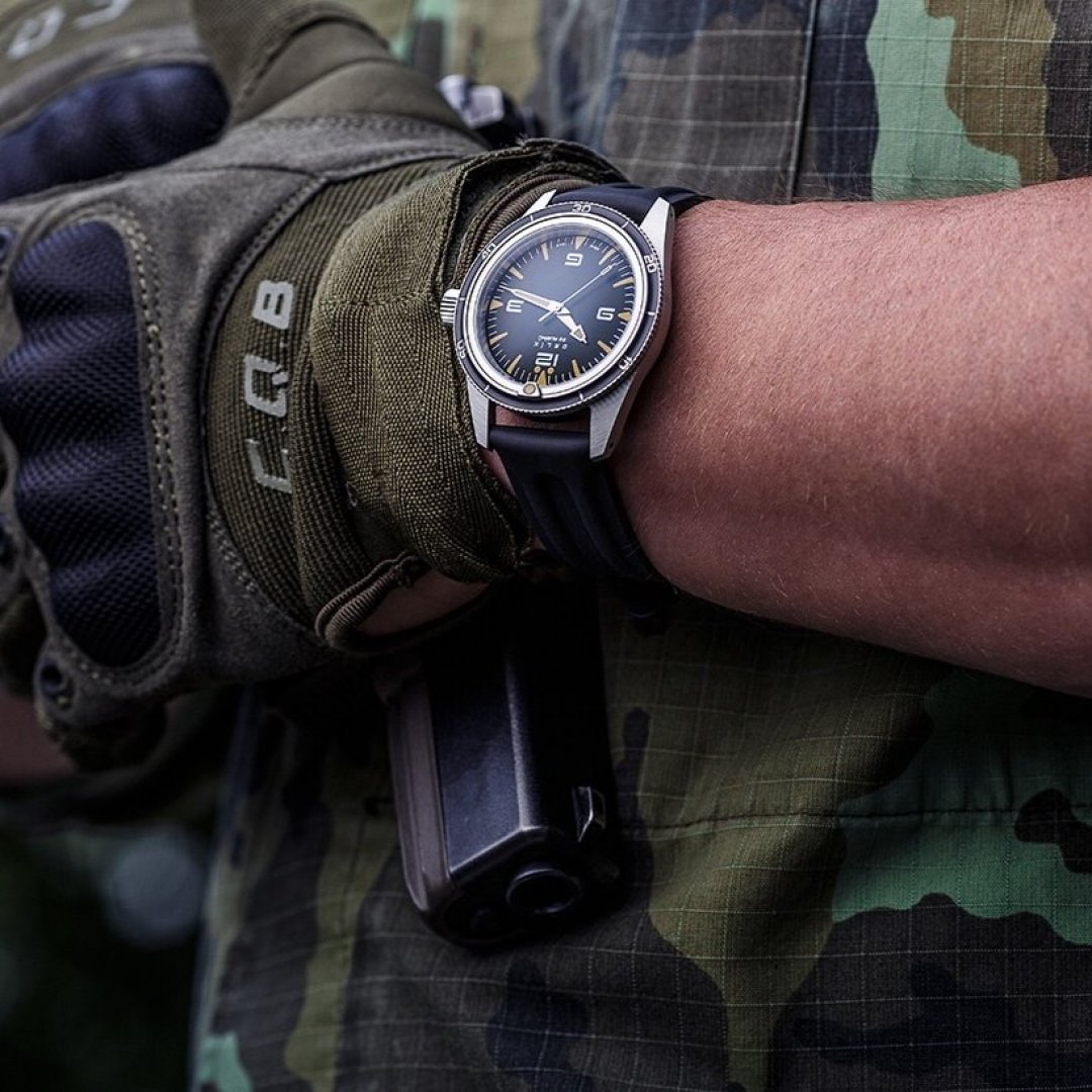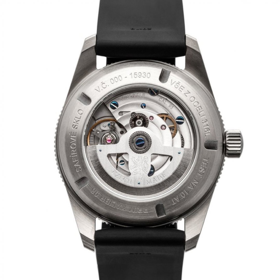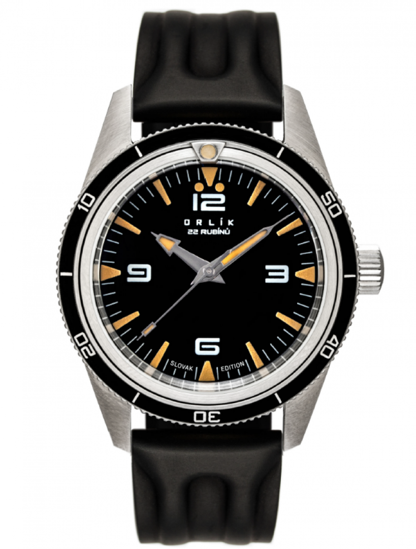 Elton Orlík 38 In-House, 38 mm. Die Uhr hat folgende Funktionen: Lumineszenz. Die Grundparameter der Uhr sind: bewegungsart ist mechanische Uhr mit automatischem Aufzug, wasserabweisend ist 100 m, ziffernblattfarbe ist schwarz und armbandmaterial ist Gummi.
