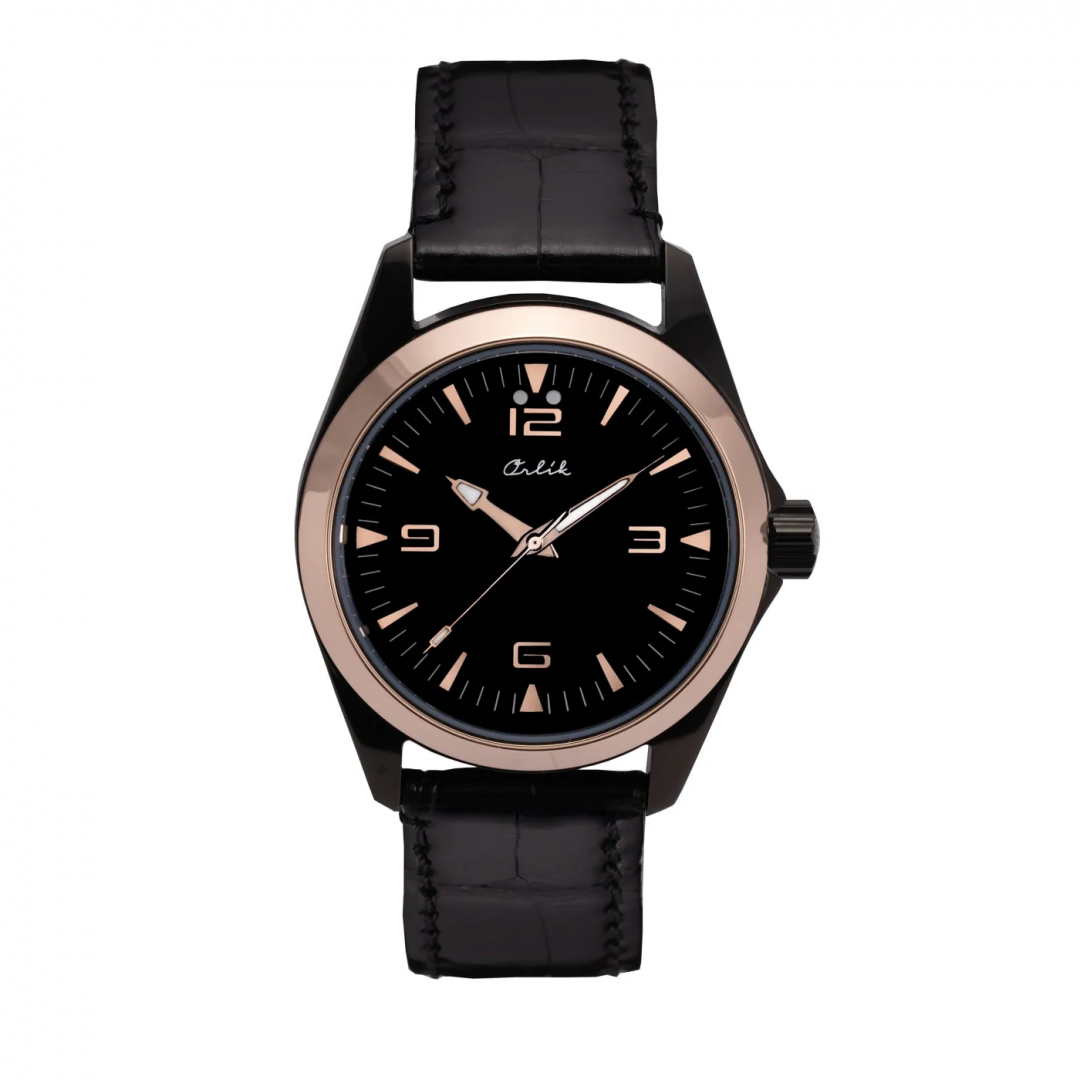 Elton Orlík Limitierte Auflage, In-house calibre, 38 mm. Die Uhr hat folgende Funktionen: Lumineszenz. Die Grundparameter der Uhr sind: ziffernblattfarbe ist schwarz, bewegungsart ist mechanische Uhr mit automatischem Aufzug, armbandmaterial ist Leder und wasserabweisend ist 100 m.