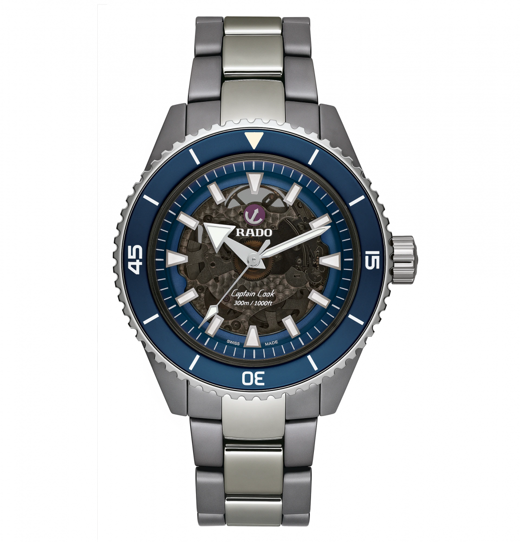 Rado Captain Cook Automatic Automatik, Wasserdicht 300M, 43 mm. Die Uhr hat folgende Funktionen: Lumineszenz. Die Grundparameter der Uhr sind: ziffernblattfarbe ist transparent, bewegungsart ist mechanische Uhr mit automatischem Aufzug, armbandmaterial ist Titan und Plasmakeramik und wasserabweisend ist 300 m.