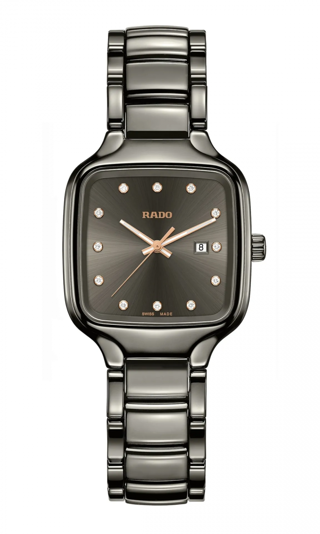 Rado True SQUARE DIAMONDS Diamante, Quartz, 29 mm. Die Uhr hat folgende Funktionen: Datum , Lumineszenz und E.O.L.. Die Grundparameter der Uhr sind: wasserabweisend ist 50 m, bewegungsart ist Quarzuhren, ziffernblattfarbe ist grau und armbandmaterial ist Plasmakeramik.