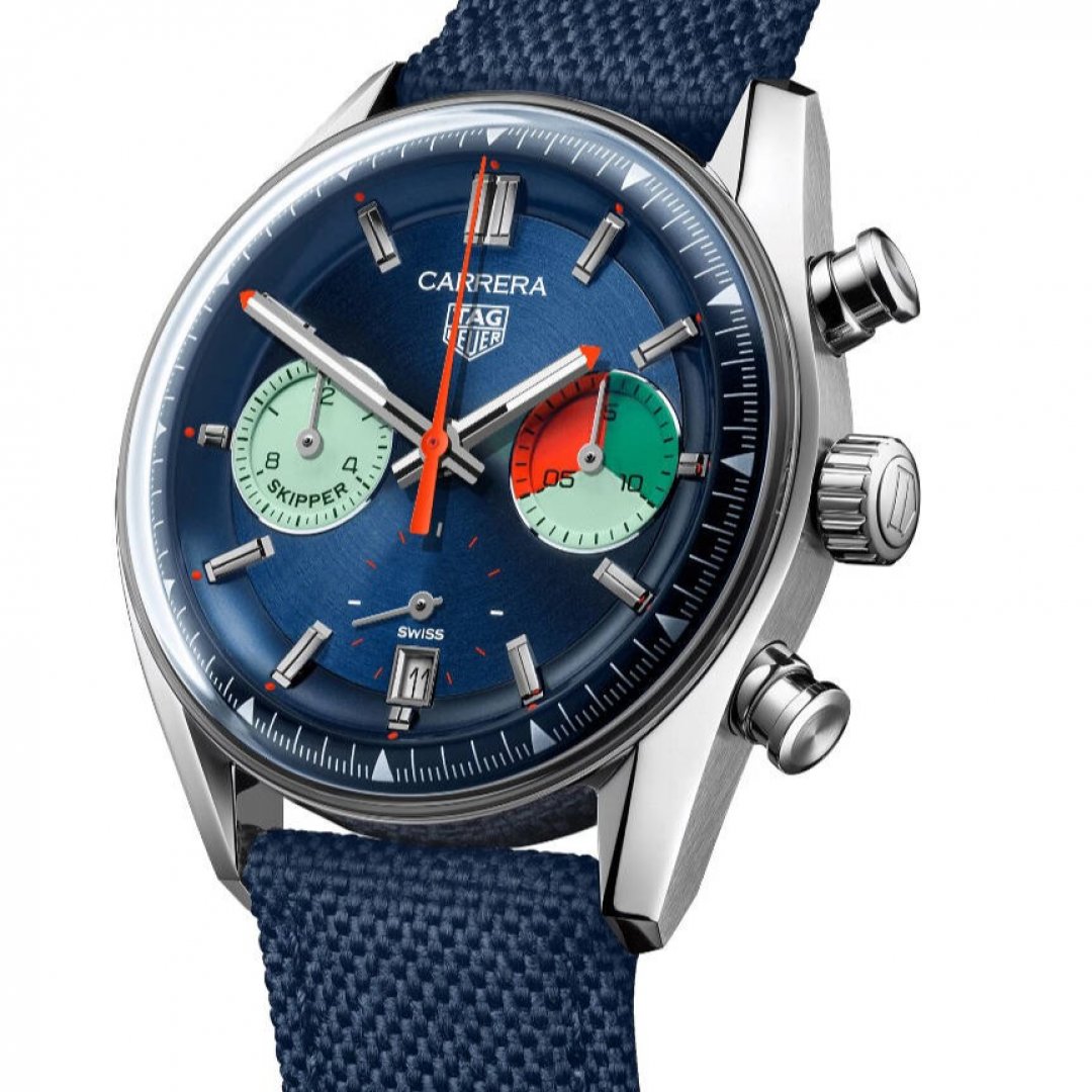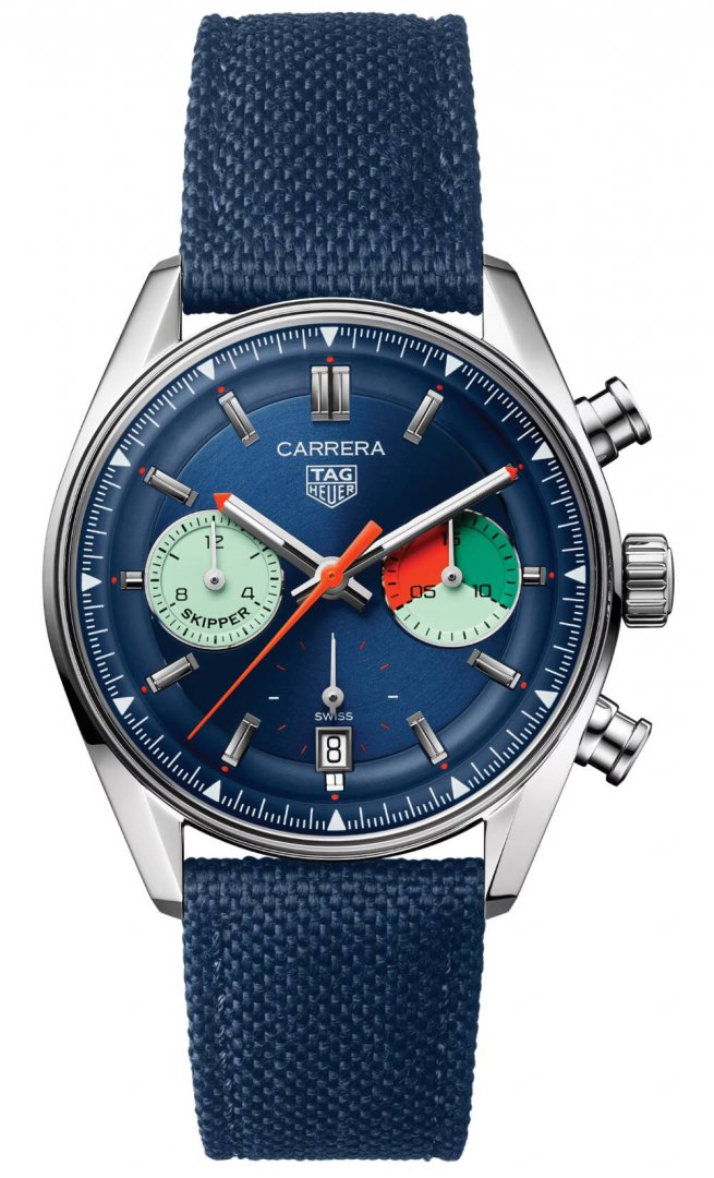 TAG Heuer Carrera Skipper TH20-06, Wasserdicht 100M, 39 mm. Die Uhr hat folgende Funktionen: Lumineszenz, Stoppuhr und Datum . Die Grundparameter der Uhr sind: bewegungsart ist mechanischer Chronograph mit automatischem Aufzug, wasserabweisend ist 100 m, ziffernblattfarbe ist blau und armbandmaterial ist Textilien.