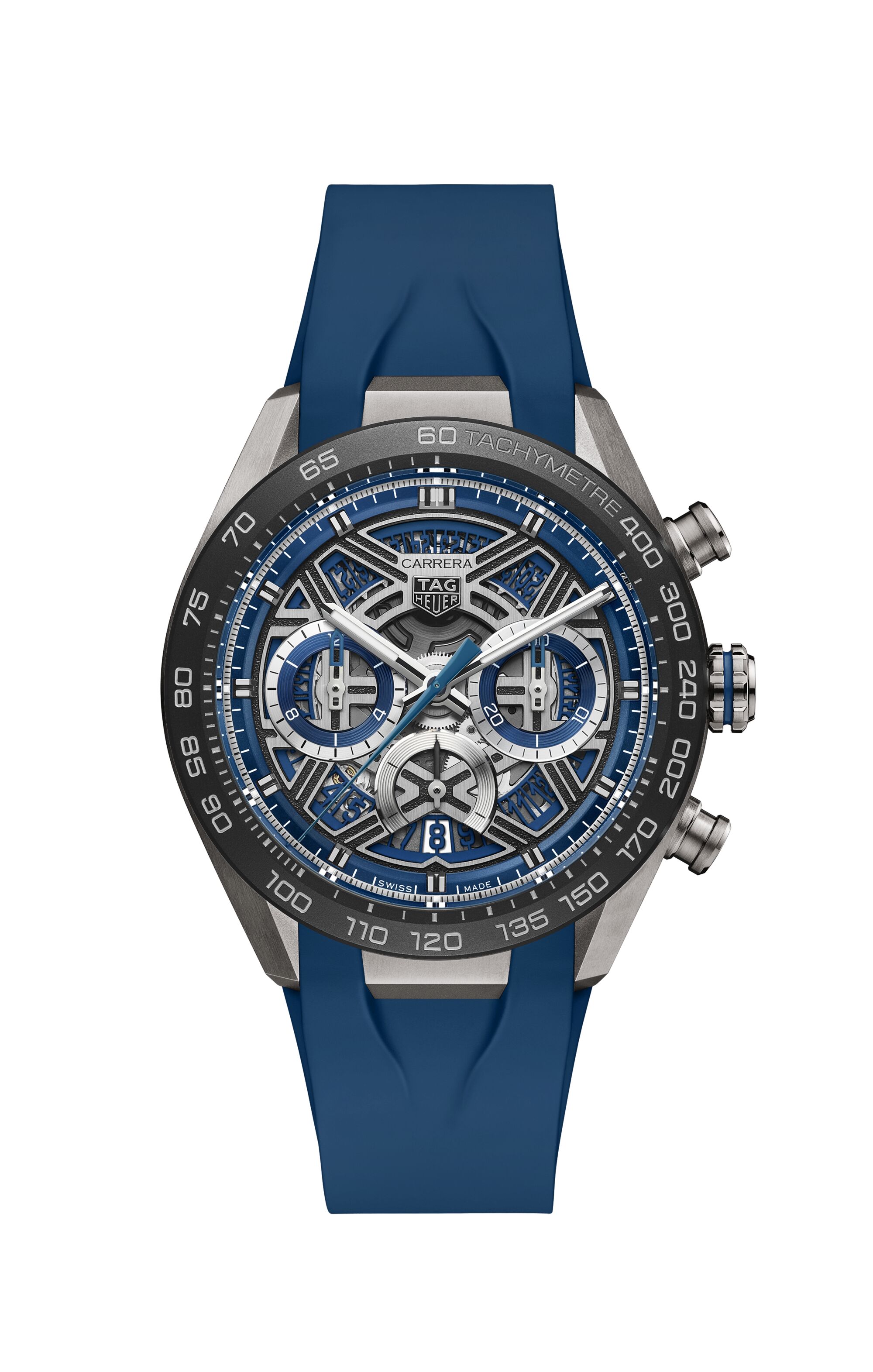 TAG Heuer Carrera Chronograph Extreme Sport In-House movement TH20-00, 44 mm. Die Uhr hat folgende Funktionen: Lumineszenz, Stoppuhr, Tachymeter-Skala, Datum und Dualzeit. Die Grundparameter der Uhr sind: ziffernblattfarbe ist transparent und blau, bewegungsart ist mechanischer Chronograph mit automatischem Aufzug, armbandmaterial ist Gummi und wasserabweisend ist 100 m.