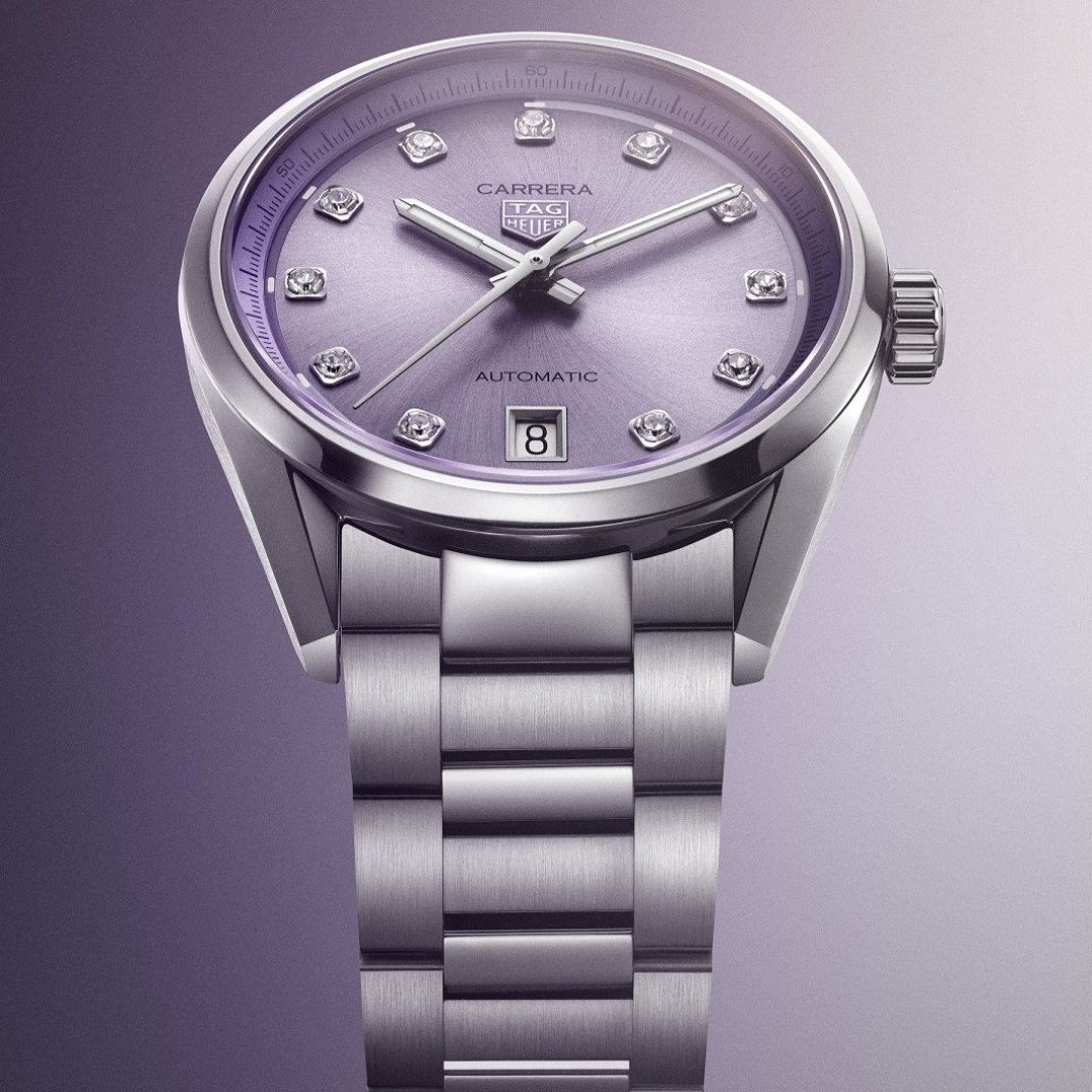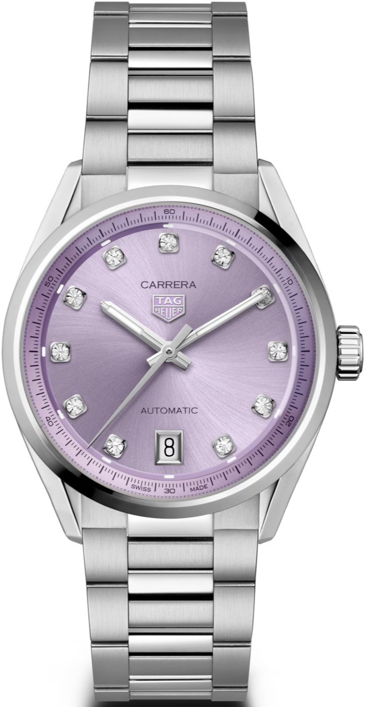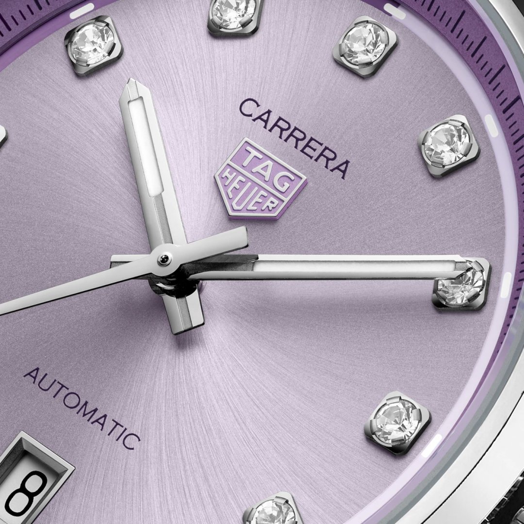 TAG Heuer Carrera Calibre 7, Diamante & Automatik, 36 mm. Die Uhr hat folgende Funktionen: Lumineszenz und Datum . Die Grundparameter der Uhr sind: bewegungsart ist mechanische Uhr mit automatischem Aufzug, armbandmaterial ist Stahl, wasserabweisend ist 50 m und ziffernblattfarbe ist lila.