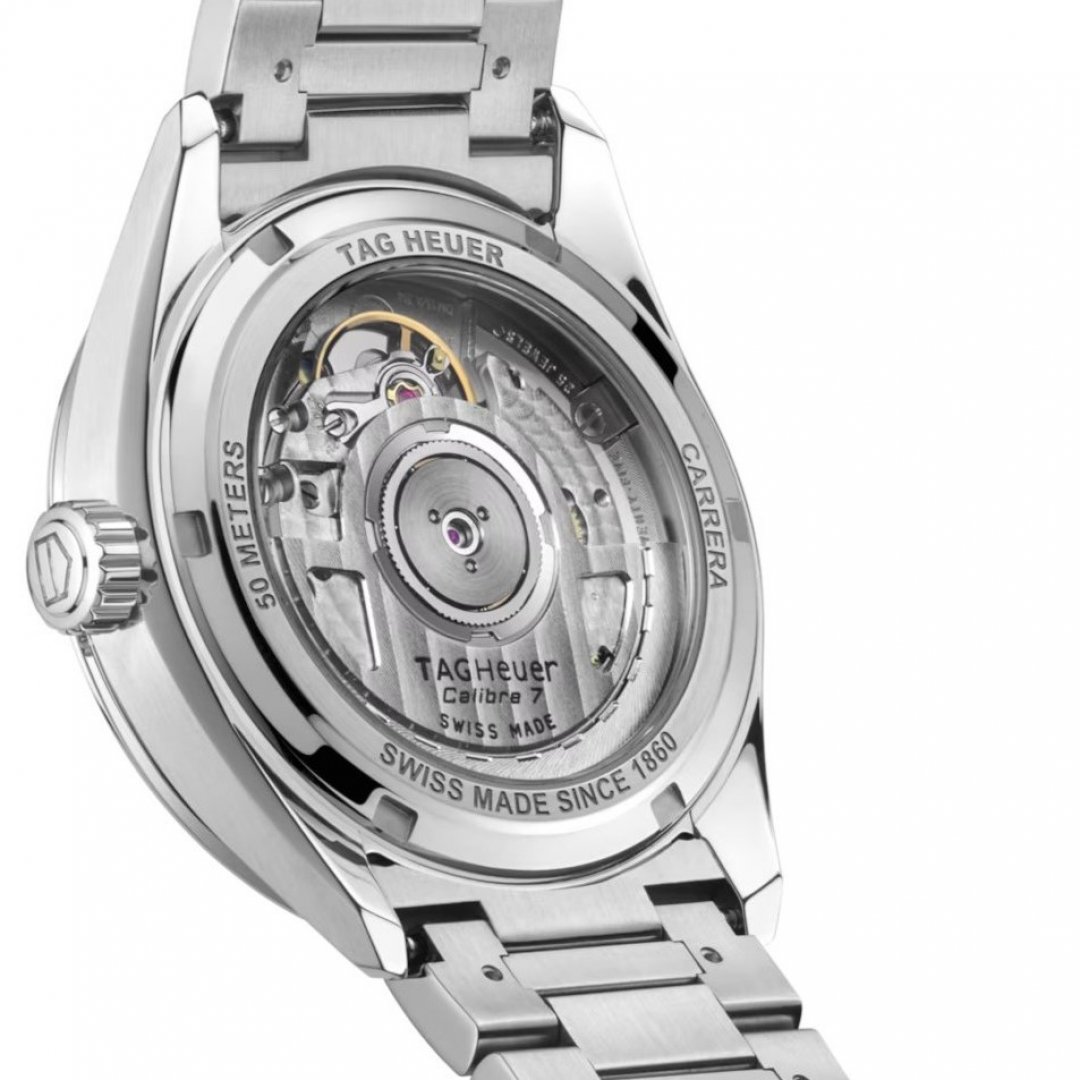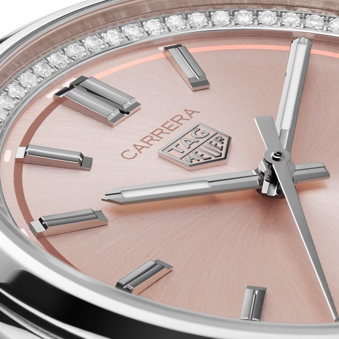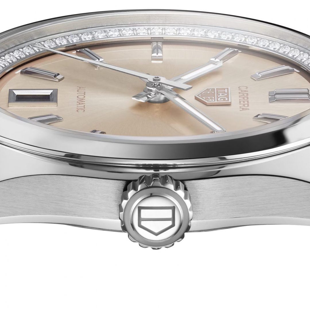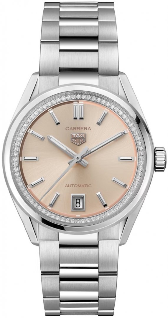TAG Heuer Carrera Calibre 7, Diamanten, Automatik, 36 mm. Die Uhr hat folgende Funktionen: Lumineszenz und Datum . Die Grundparameter der Uhr sind: bewegungsart ist mechanische Uhr mit automatischem Aufzug, armbandmaterial ist Stahl, wasserabweisend ist 50 m und ziffernblattfarbe ist rosa.