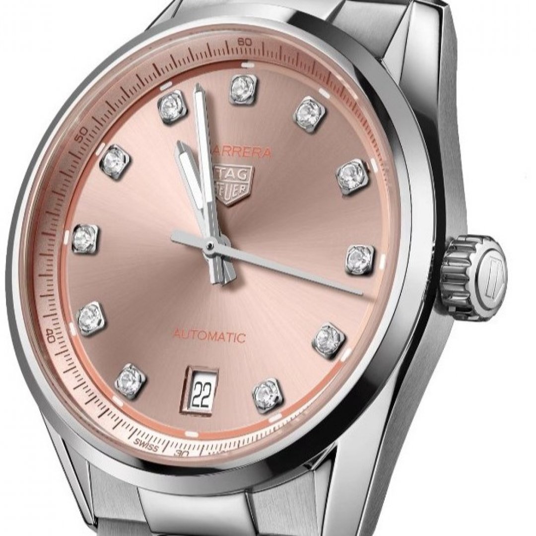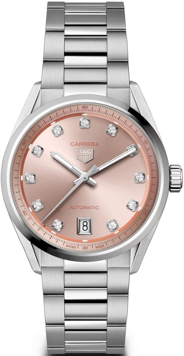 TAG Heuer Carrera Calibre 7, Diamante & Automatik, 36 mm. Die Uhr hat folgende Funktionen: Lumineszenz und Datum . Die Grundparameter der Uhr sind: bewegungsart ist mechanische Uhr mit automatischem Aufzug, armbandmaterial ist Stahl, wasserabweisend ist 50 m und ziffernblattfarbe ist rosa.