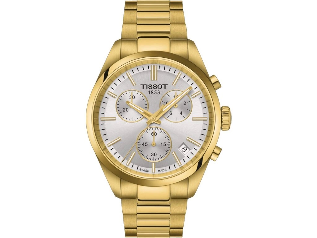 Tissot PR100 Quartz Chronograph, Wasserdicht 100M, 40 mm. Die Uhr hat folgende Funktionen: Lumineszenz, Stoppuhr und Datum . Die Grundparameter der Uhr sind: bewegungsart ist Quarz-Chronograph, wasserabweisend ist 100 m, armbandmaterial ist Stahl und ziffernblattfarbe ist silbern.