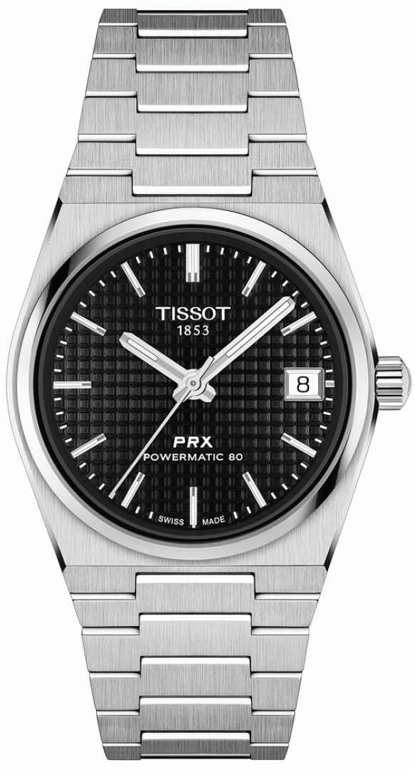 Tissot PRX POWERMATIC 80 POWERMATIC 80, 35 mm. Die Uhr hat folgende Funktionen: Datum . Die Grundparameter der Uhr sind: armbandmaterial ist Stahl, wasserabweisend ist 100 m, bewegungsart ist mechanische Uhr mit automatischem Aufzug und ziffernblattfarbe ist schwarz.