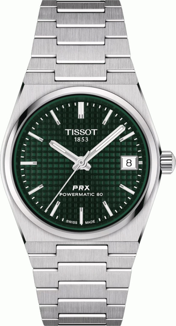 Tissot PRX POWERMATIC 80 POWERMATIC 80, 35 mm. Die Uhr hat folgende Funktionen: Datum . Die Grundparameter der Uhr sind: armbandmaterial ist Stahl, wasserabweisend ist 100 m, bewegungsart ist mechanische Uhr mit automatischem Aufzug und ziffernblattfarbe ist grün.