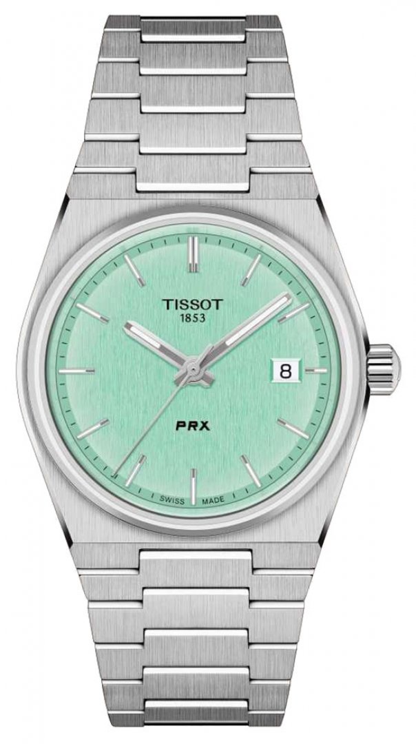 Tissot PRX Quartz, Wasserdicht 100M, 35 mm. Die Uhr hat folgende Funktionen: Datum . Die Grundparameter der Uhr sind: bewegungsart ist Quarzuhren, wasserabweisend ist 100 m, armbandmaterial ist Stahl und ziffernblattfarbe ist türkis.