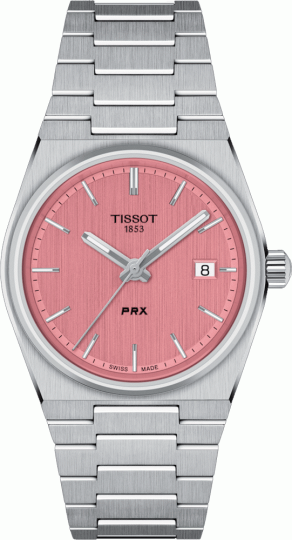 Tissot PRX Quartz, Wasserdicht 100M, 40 mm. Die Uhr hat folgende Funktionen: Datum . Die Grundparameter der Uhr sind: bewegungsart ist Quarzuhren, wasserabweisend ist 100 m, armbandmaterial ist Stahl und ziffernblattfarbe ist rosa.