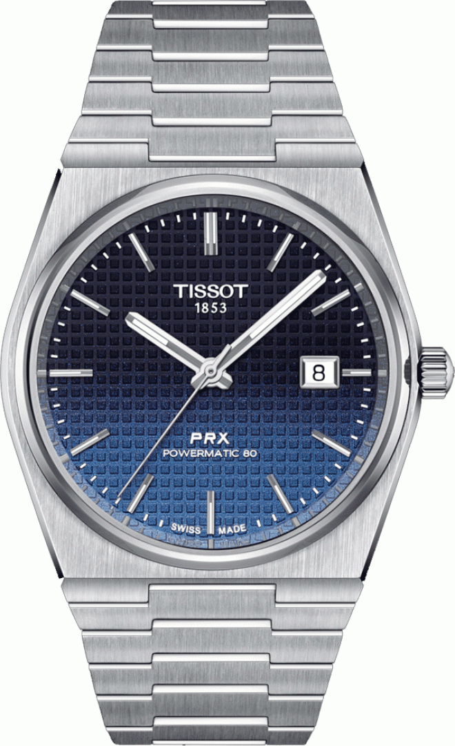 Tissot PRX POWERMATIC 80 POWERMATIC 80, 40 mm. Die Uhr hat folgende Funktionen: Datum . Die Grundparameter der Uhr sind: armbandmaterial ist Stahl, wasserabweisend ist 100 m, bewegungsart ist mechanische Uhr mit automatischem Aufzug und ziffernblattfarbe ist schwarz und blau.