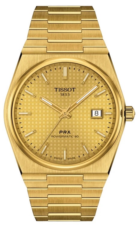 Tissot PRX POWERMATIC 80 POWERMATIC 80, 40 mm. Die Uhr hat folgende Funktionen: Datum . Die Grundparameter der Uhr sind: armbandmaterial ist Stahl, wasserabweisend ist 100 m, bewegungsart ist mechanische Uhr mit automatischem Aufzug und ziffernblattfarbe ist golden.