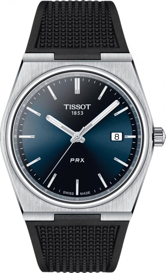 Tissot PRX Quartrz, Wasserdicht 100M, 40 mm. Die Uhr hat folgende Funktionen: Datum , Lumineszenz und E.O.L.. Die Grundparameter der Uhr sind: bewegungsart ist Quarzuhren, wasserabweisend ist 100 m, armbandmaterial ist Gummi und ziffernblattfarbe ist blau.