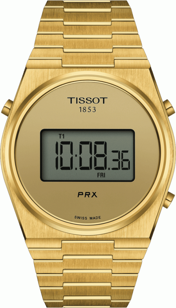 Tissot PRX DIGITAL Quartz, Wasserdicht 100M, 40 mm. Die Uhr hat folgende Funktionen: Datum , Alarm, Dualzeit, Datum und Stoppuhr. Die Grundparameter der Uhr sind: bewegungsart ist Quarzuhren, wasserabweisend ist 100 m, armbandmaterial ist Stahl und ziffernblattfarbe ist golden.