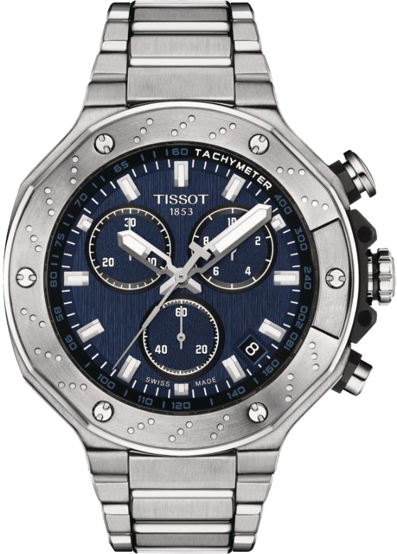 Tissot T-Race Quartz Chronograph, Wasser dicht 100M, 45 mm. Die Uhr hat folgende Funktionen: Lumineszenz, Stoppuhr, Tachymeter-Skala, Datum und E.O.L.. Die Grundparameter der Uhr sind: bewegungsart ist Quarz-Chronograph, armbandmaterial ist Stahl, wasserabweisend ist 100 m und ziffernblattfarbe ist blau.