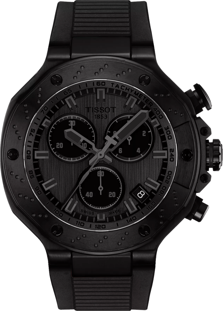 Tissot T-Race Quartz Chronograph, Wasser dicht 100M, 45 mm. Die Uhr hat folgende Funktionen: Lumineszenz, Stoppuhr, Tachymeter-Skala, Datum und E.O.L.. Die Grundparameter der Uhr sind: bewegungsart ist Quarz-Chronograph, wasserabweisend ist 100 m, ziffernblattfarbe ist schwarz und armbandmaterial ist Gummi.