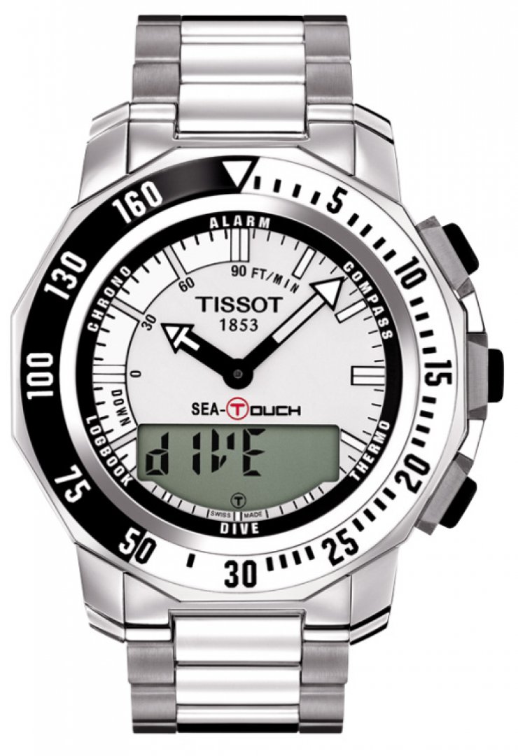 Tissot T-Touch SEA TOUCH Quartz, 44 mm. Die Uhr hat folgende Funktionen: Alarm, Barometer, Dualzeit, Tiefenmesser, Datum, Kompass, Lumineszenz, Countdown, Stoppuhr, Weltzeit, Thermometer, Datum , ewiger Kalender und multifunktional. Die Grundparameter der Uhr sind: bewegungsart ist Quarz-Chronograph und spezial, armbandmaterial ist Stahl und wasserabweisend ist 100 m.