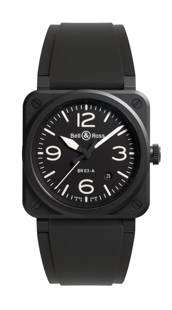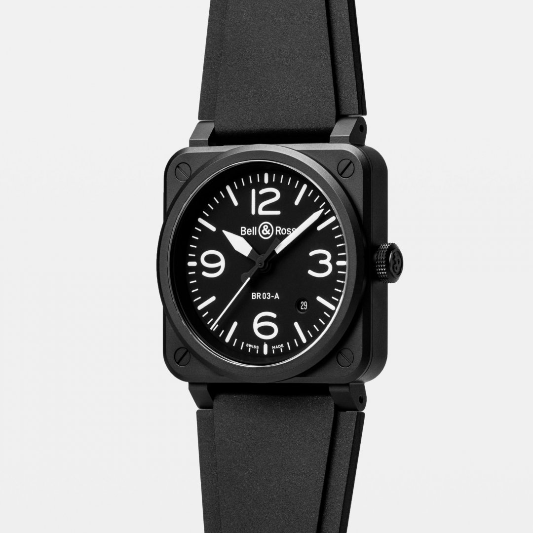 luxury watches Bell & Ross BR 03 AUTO Automatic, Water resistance 100M, 41 mm. The watch has functions luminescence and date . Basic parameters of the watch are: dial colour is black, movement type is mechanical watch with automatic winding, strap material is rubber and textiles and water resistance is 100 m.