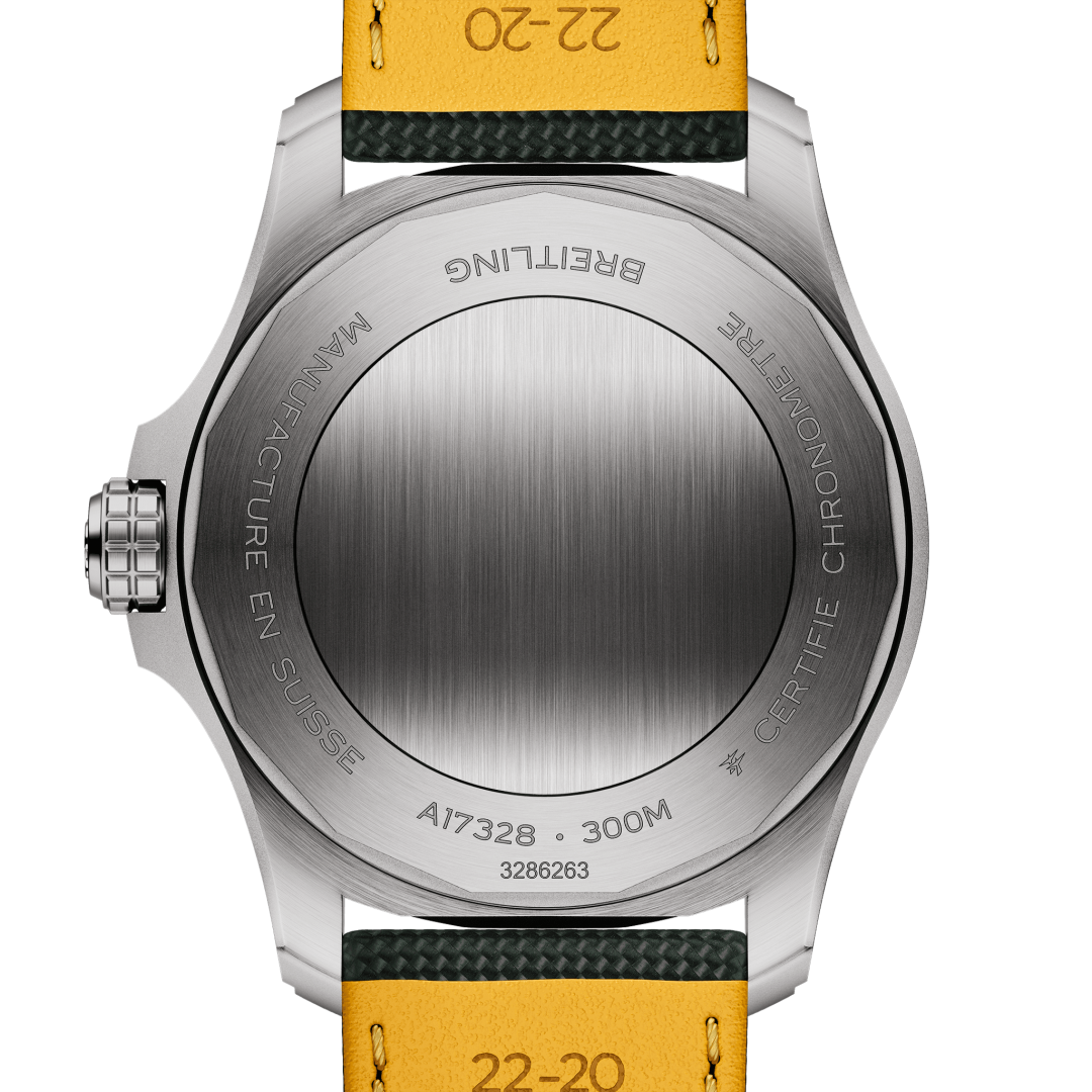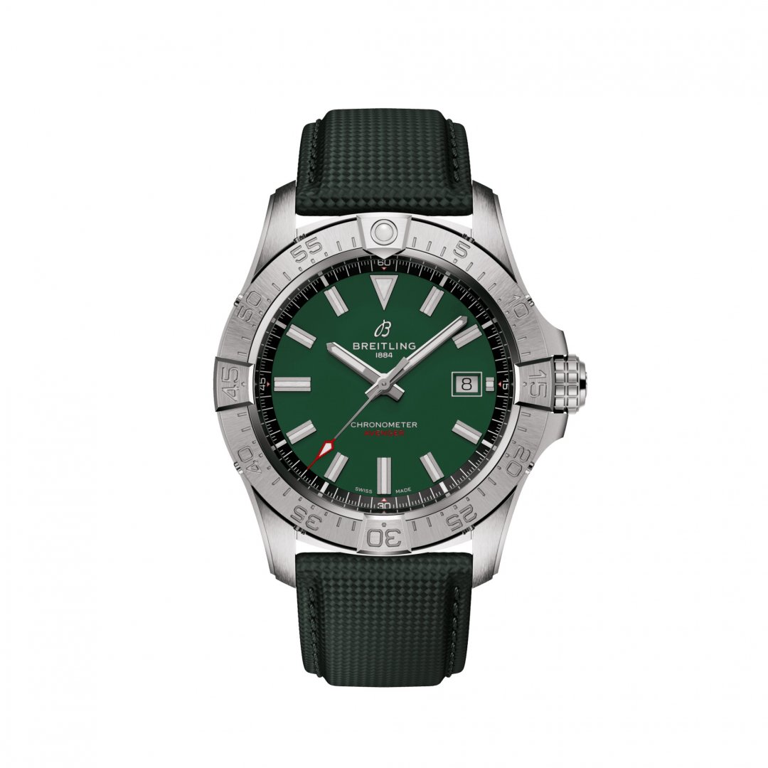 luxury watches Breitling Avenger Automatic 42 Automatic, Water resistance 300M, 42 mm. The watch has functions luminescence and date . Basic parameters of the watch are: water resistance is 300 m, movement type is mechanical watch with automatic winding, dial colour is green and strap material is leather.