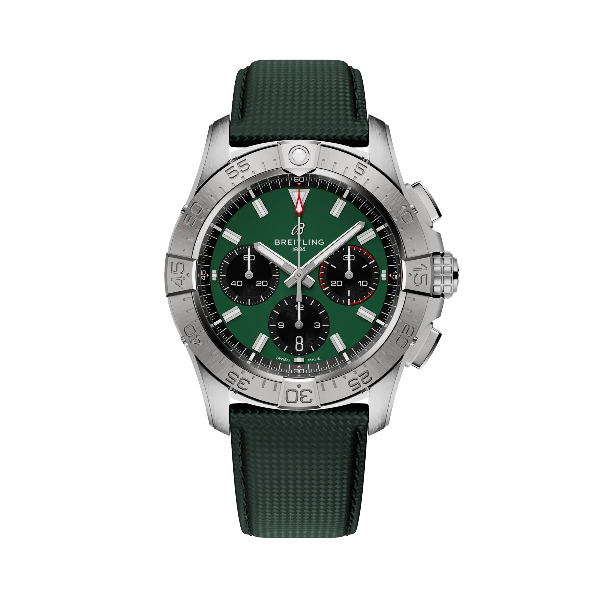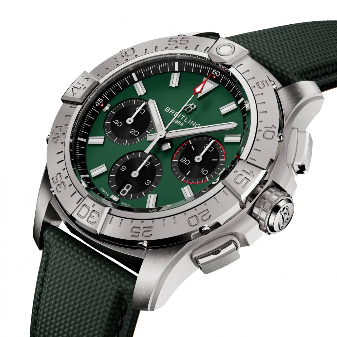 luxury watches Breitling Avenger B01 Chronograph 42 In-house movement, Water resistance 300M, 42 mm. The watch has functions luminescence, stopwatch and date . Basic parameters of the watch are: movement type is mechanical chronograph with automatic winding, water resistance is 300 m, strap material is leather and dial colour is green.
