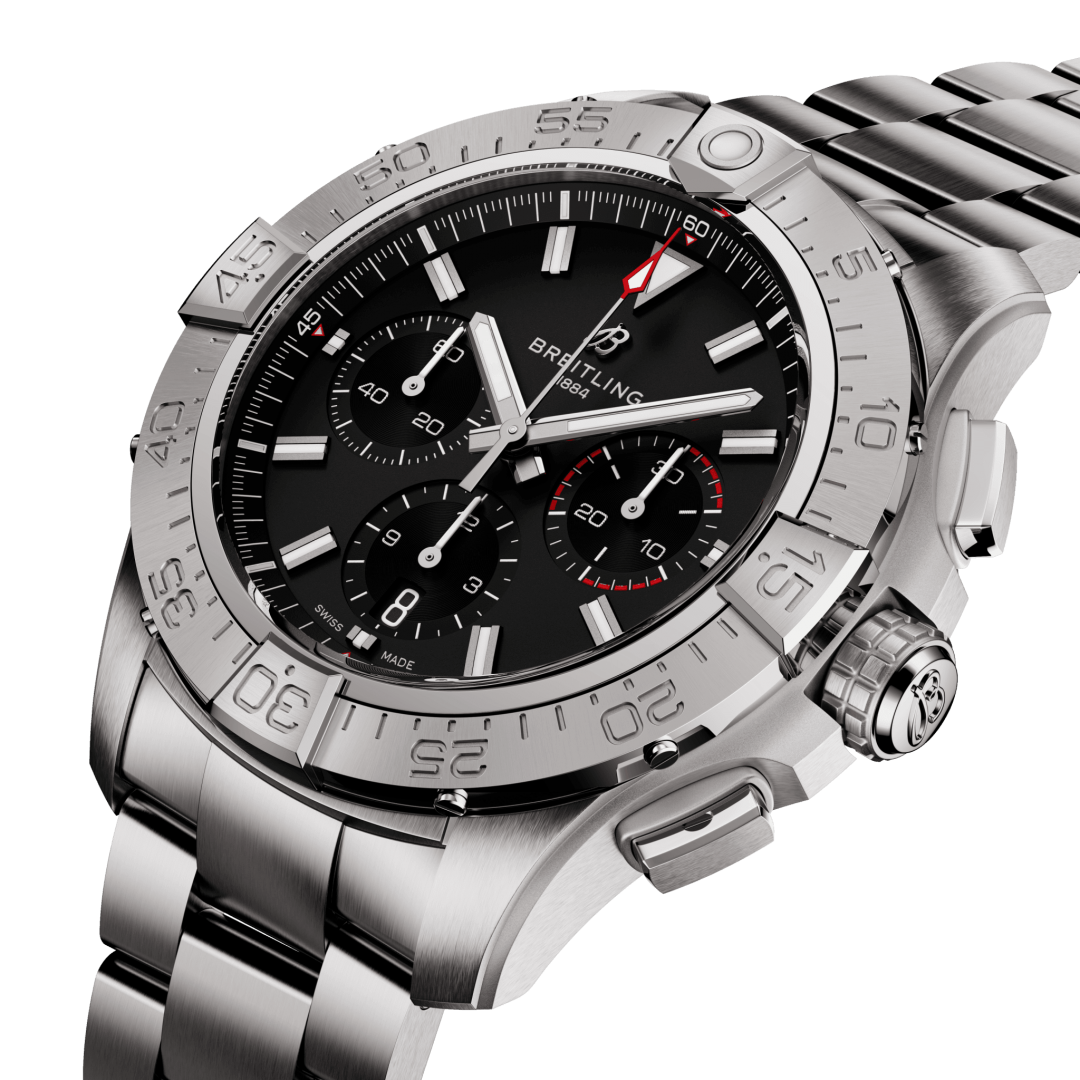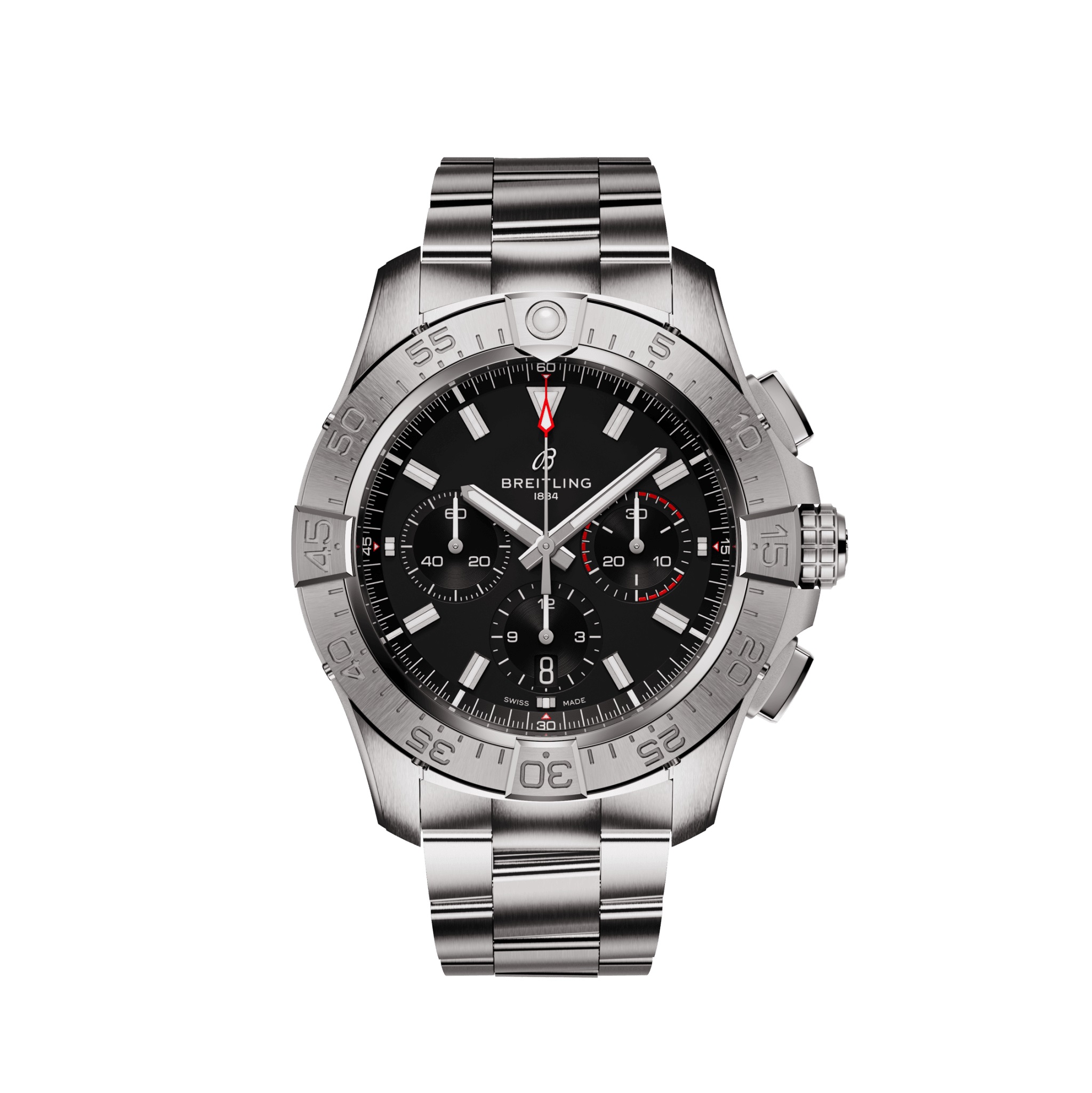 luxury watches Breitling Avenger B01 Chronograph 44 In-house movement, Vater resist 300M, 44 mm. The watch has functions luminescence, stopwatch and date . Basic parameters of the watch are: movement type is mechanical chronograph with automatic winding, water resistance is 300 m, dial colour is black and strap material is steel.