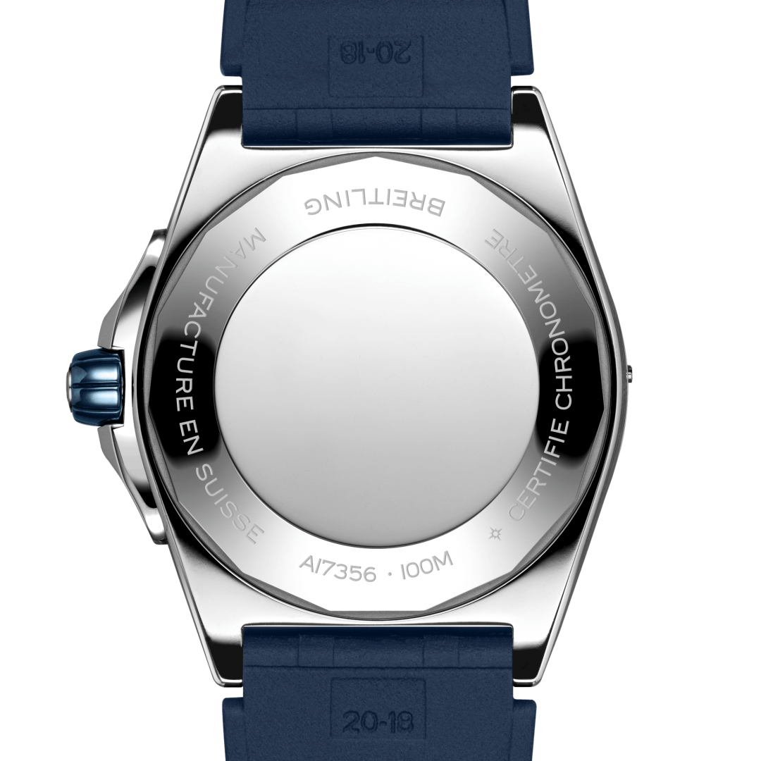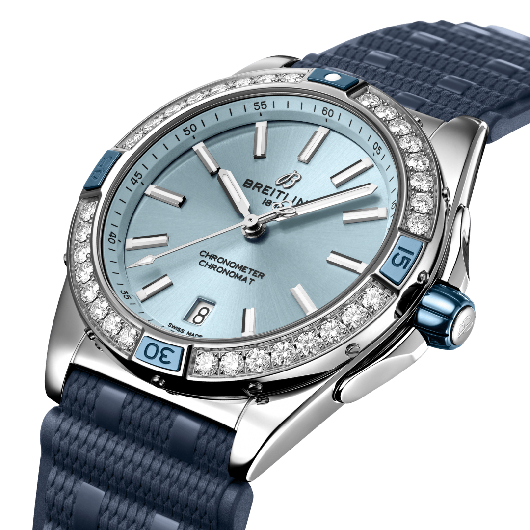 luxury watches Breitling Chronomat Automatic 38 Diamonds, Automatic, 38 mm. The watch has functions luminescence and date . Basic parameters of the watch are: dial colour is blue, movement type is mechanical watch with automatic winding, water resistance is 100 m and strap material is rubber.