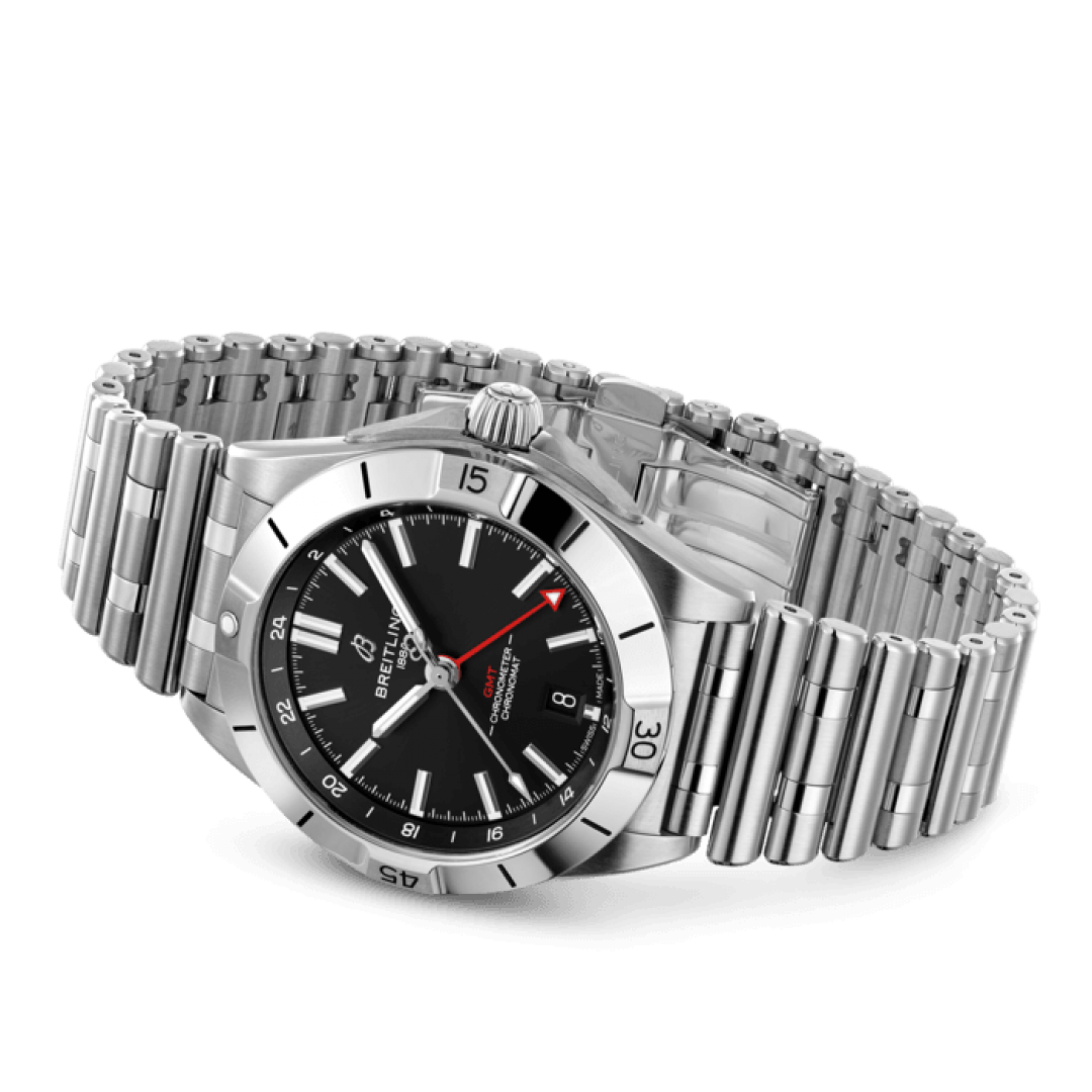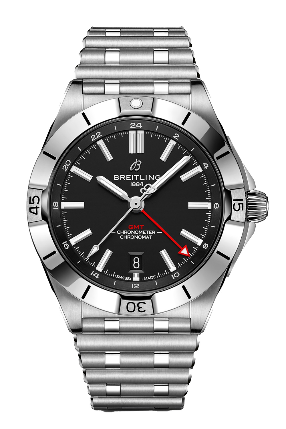 luxury watches Breitling Chronomat Automatic 40 GMT Automatic, 40 mm. The watch has functions dual time, luminescence and date . Basic parameters of the watch are: dial colour is black, movement type is mechanical watch with automatic winding, strap material is steel and water resistance is 200 m.