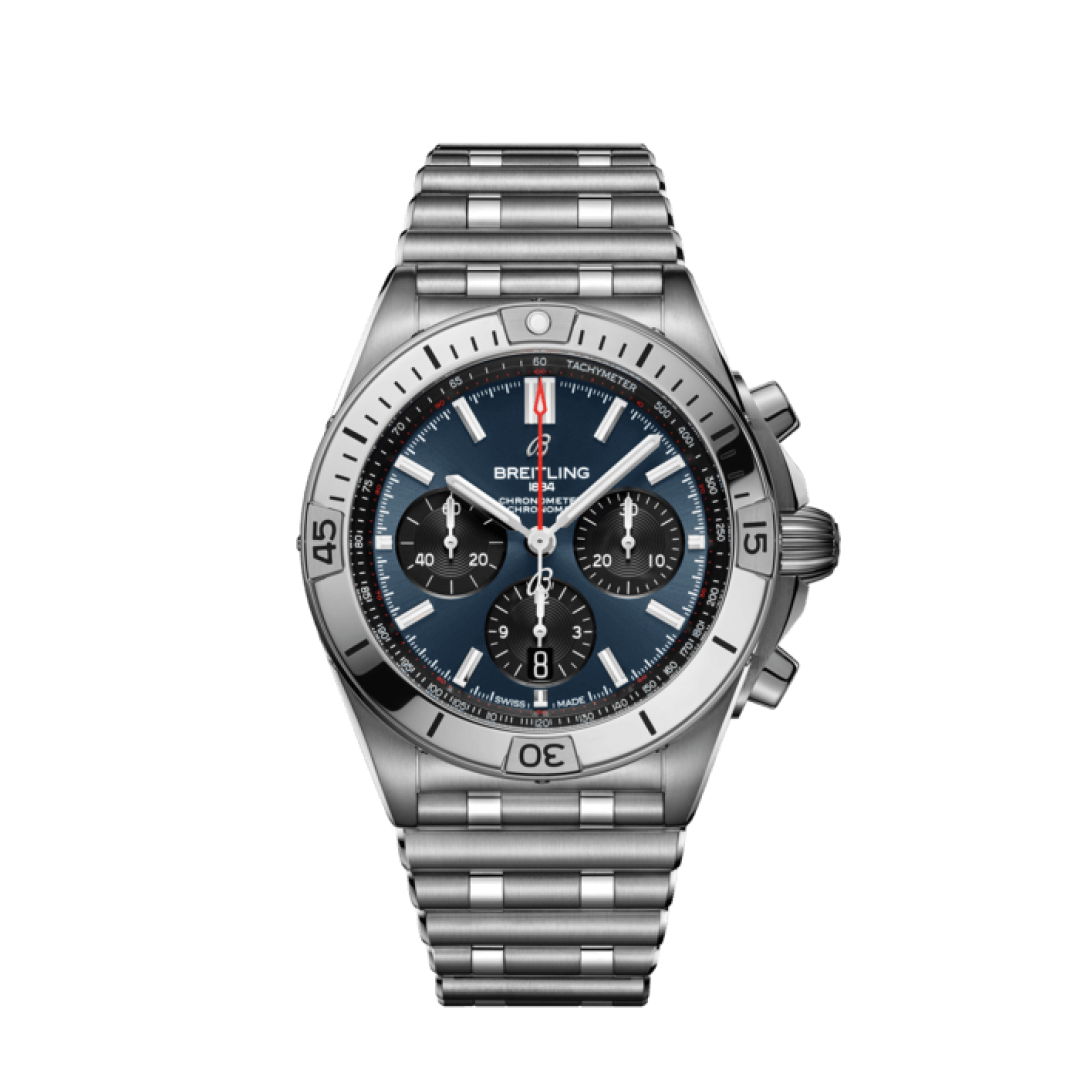 luxury watches Breitling Chronomat B01 42 In-house movement, Water resist 200M, 42 mm. The watch has functions luminescence, stopwatch and date . Basic parameters of the watch are: movement type is mechanical chronograph with automatic winding, strap material is steel, dial colour is blue and water resistance is 200 m.