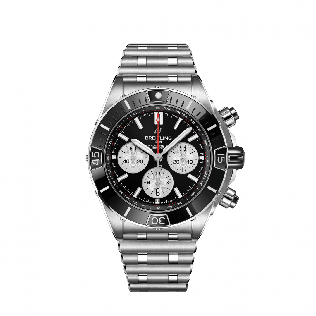 luxury watches Breitling Chronomat Super Chronomat B01 In-house calibre, Water resistance 200M, 44 mm. The watch has functions luminescence, stopwatch, date and Tachymeter scale. Basic parameters of the watch are: dial colour is silver and black, movement type is mechanical chronograph with automatic winding, water resistance is 200 m and strap material is steel.