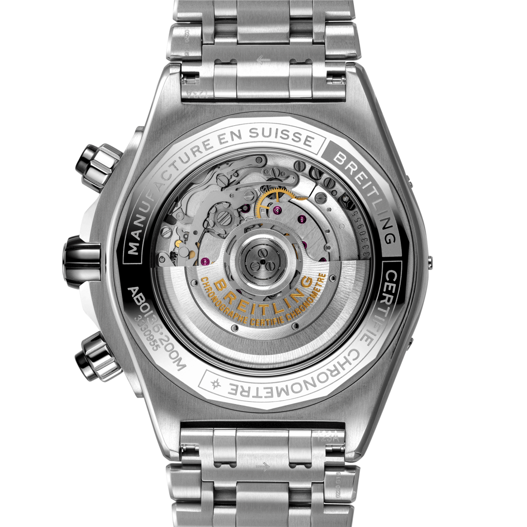 Development and progress culminated in the creation of the first IN-HOUSE caliber, designated 01. It had a 3-day power reserve, a high-precision chronograph, and a 5-year warranty. Manufactured and assembled 100% IN-HOUSE at the newly built Breitling Chronometrie factory in La Chaux-de-Fonds. The new movement immediately attracted the attention of both experts and the general public, with experts ranking the Caliber 01 among the ten best chronographs in the world. The motto "Instruments for professionals" says it all.