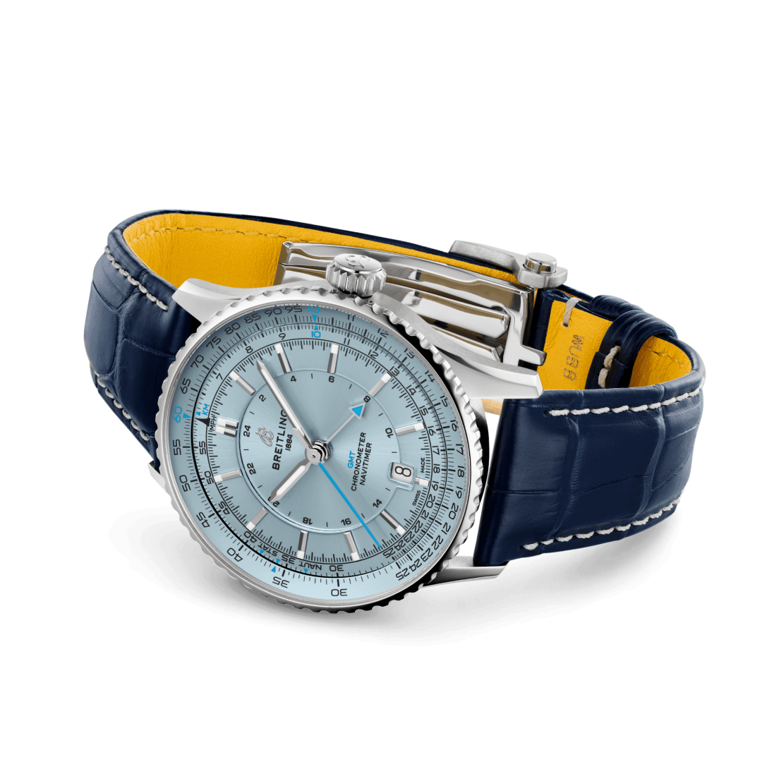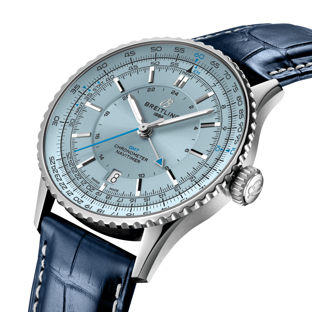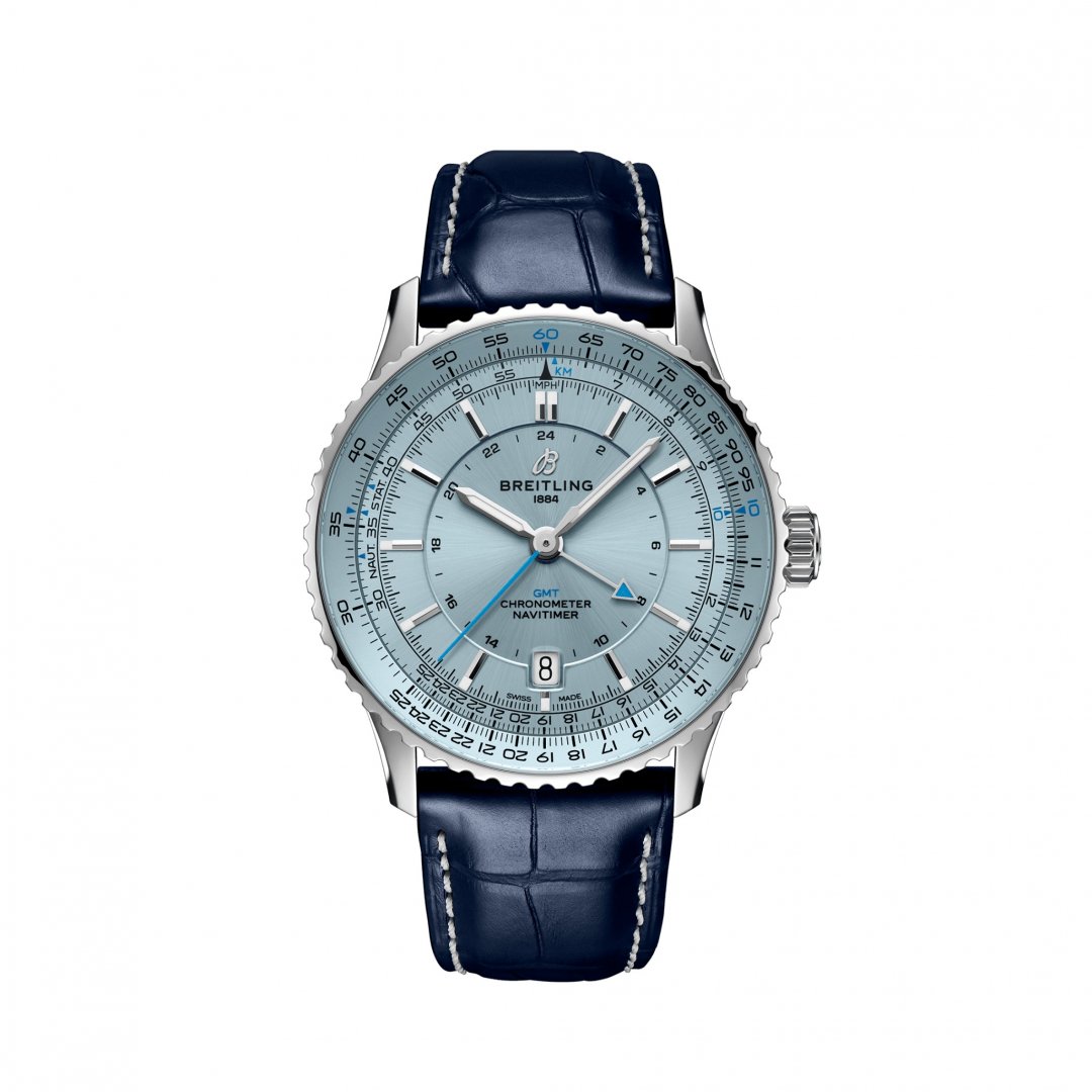 luxury watches Breitling Navitimer Automatic GMT 41 Automatic, 41 mm. The watch has functions luminescence, logaritmic ruler and dual time. Basic parameters of the watch are: movement type is mechanical watch with automatic winding, water resistance is 30 m, strap material is leather and dial colour is blue.