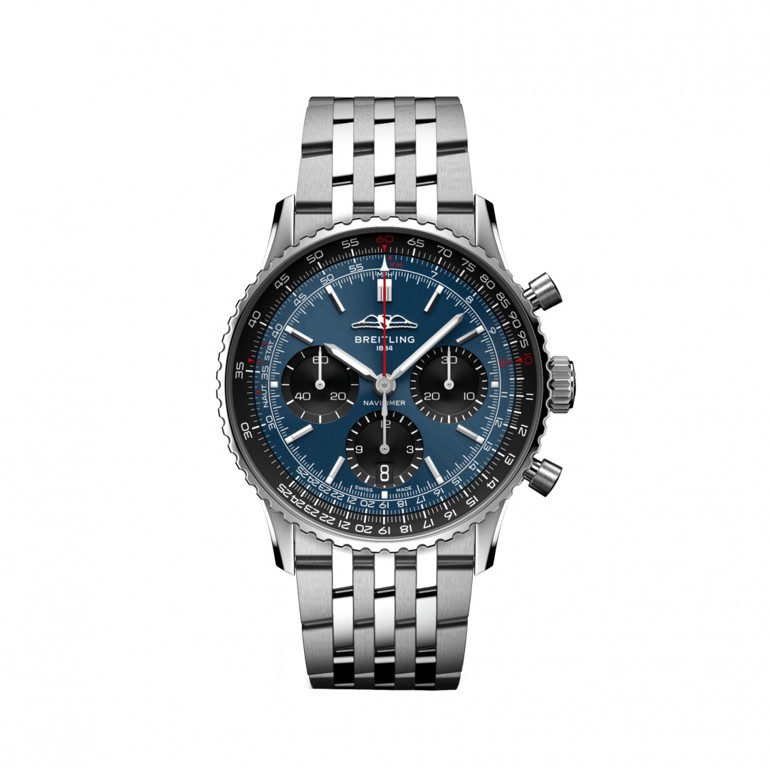 luxury watches Breitling Navitimer B01 Chronograph 41 In-house Calibre, 41 mm. The watch has functions luminescence, stopwatch, date and logaritmic ruler. Basic parameters of the watch are: movement type is mechanical chronograph with automatic winding, water resistance is 30 m, strap material is steel and dial colour is black and blue.