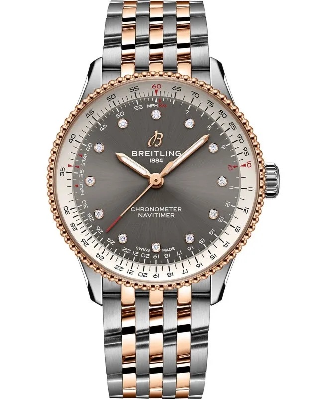 luxury watches Breitling Navitimer Automatic 36 Gold & Damonds, Automatic, 36 mm. The watch has functions luminescence. Basic parameters of the watch are: movement type is mechanical watch with automatic winding, water resistance is 30 m, strap material is steel and gold and dial colour is grey.
