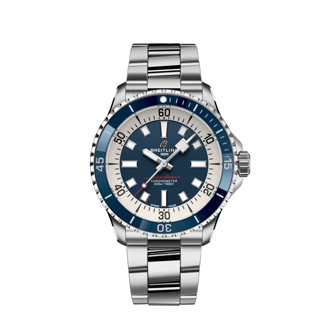 luxury watches Breitling Superocean AUTOMATIC 42 Water resistance 300M, 42 mm. The watch has functions luminescence and date . Basic parameters of the watch are: movement type is mechanical watch with automatic winding, water resistance is 300 m, dial colour is white and blue and strap material is steel.