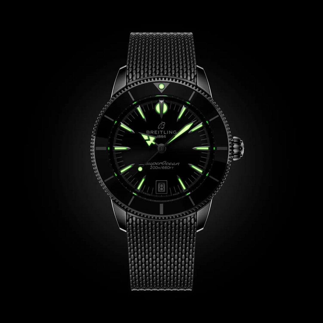 luxury watches Breitling Superocean Héritage B31 Automatic 40 Water resistance 200M, Automatic, 42 mm. The watch has functions luminescence and date . Basic parameters of the watch are: movement type is mechanical watch with automatic winding, water resistance is 200 m, strap material is steel and dial colour is green.