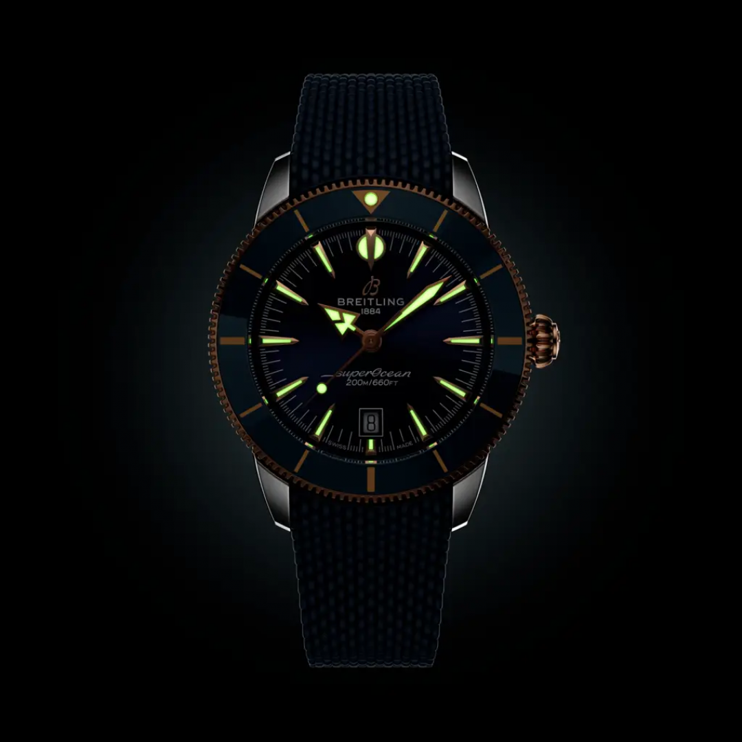 luxury watches Breitling Superocean Héritage B31 Automatic 44 Manufaktúrny kaliber, Vode odolnosť 200M, 44 mm. The watch has functions luminescence and date . Basic parameters of the watch are: movement type is mechanical watch with automatic winding, strap material is rubber, water resistance is 200 m and dial colour is blue.