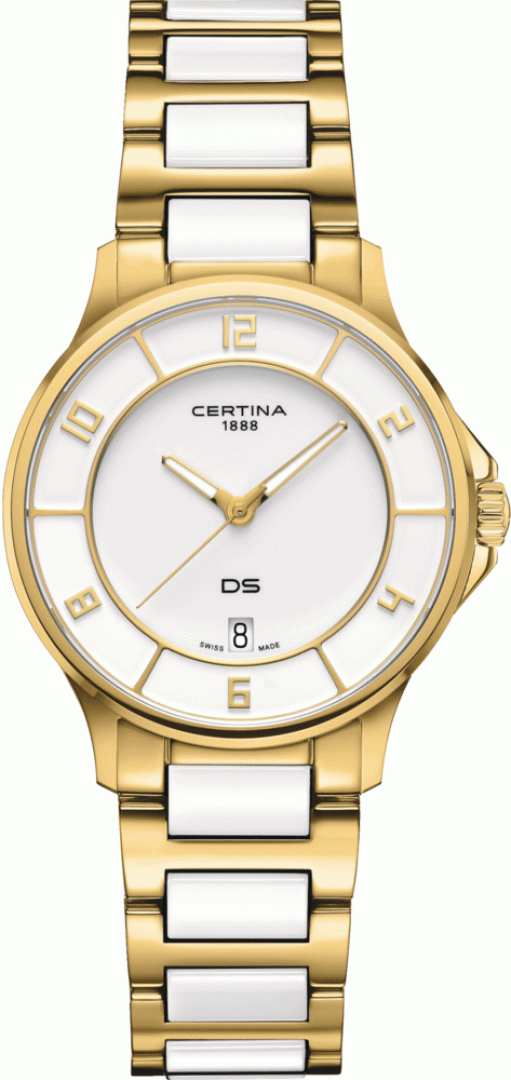 luxury watches Certina DS-6 Lady Quartz, Water resistance 100M, 35 mm. The watch has functions luminescence, date and E.O.L.. Basic parameters of the watch are: movement type is Quartz watches, strap material is ceramics and steel, water resistance is 100 m and dial colour is white.