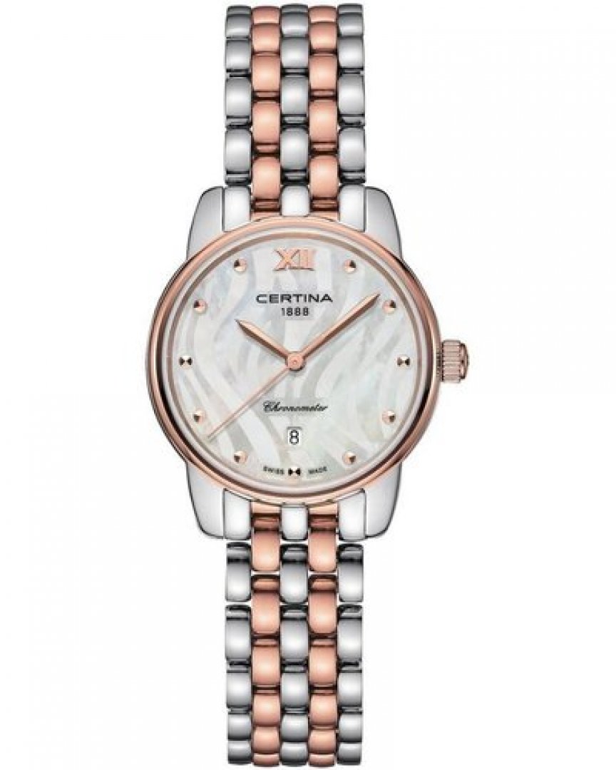 Luxury watches Certina DS-8 . The watch has functions date and E.O.L.. Basic parameters of the watch are: movement type is Quartz watches, strap material is steel, water resistent is 100 m and dial colour is silver.