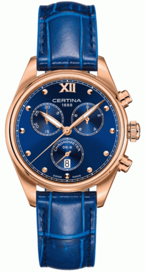 Luxury watches Certina DS-8 Lady Chronograph . The watch has functions luminescence, stopwatch, date and E.O.L.. Basic parameters of the watch are: dial colour is blue, movement type is Quartz chronograph, strap material is leather and water resistent is 100 m.