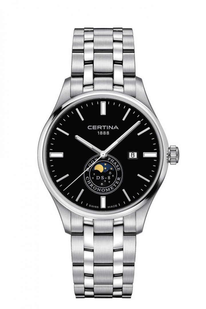 luxury watches Certina DS-8 Chronometer, Quartz, 41 mm. The watch has functions luminescence, date and moon phases. Basic parameters of the watch are: water resistance is 100 m, strap material is steel, movement type is Quartz watches and dial colour is black.