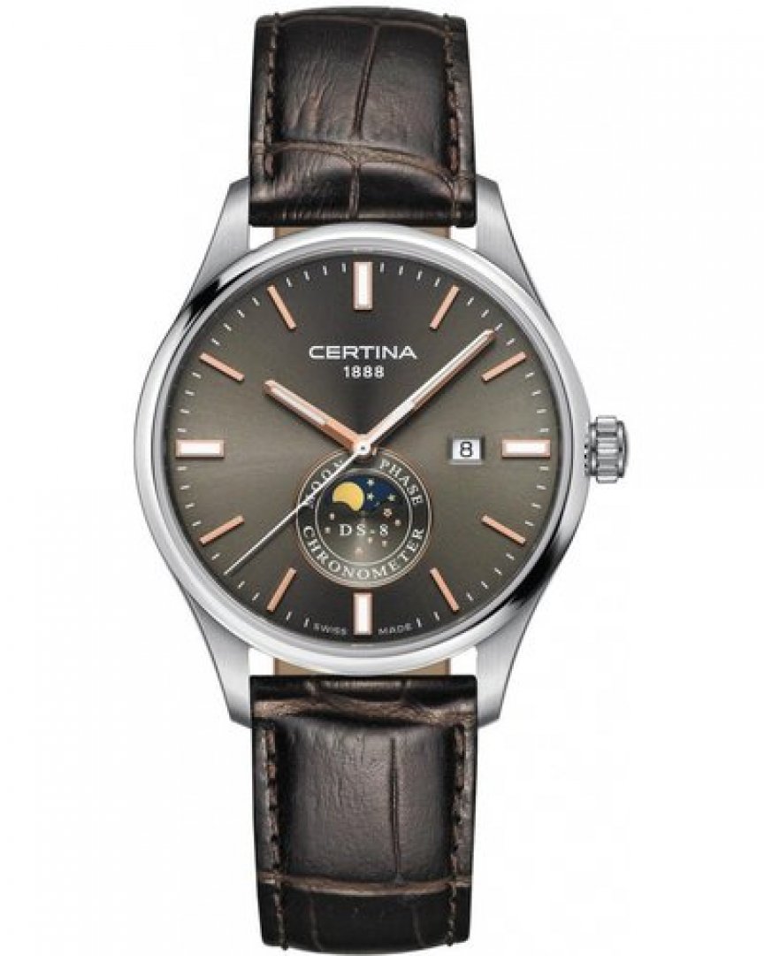 Luxury watches Certina DS-8 . The watch has functions luminescence, moon phases, date and E.O.L.. Basic parameters of the watch are: movement type is Quartz watches, strap material is leather, water resistent is 100 m and dial colour is grey.