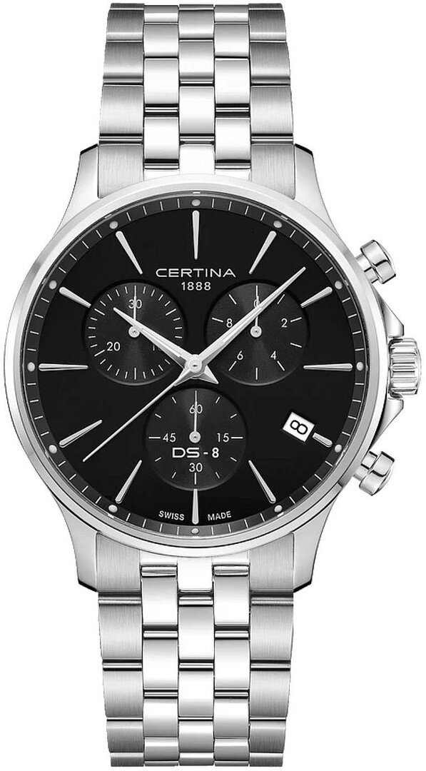luxury watches Certina DS-8 Gent Precidrive COSC Chronograph Quartz Chronograf, 41 mm. The watch has functions date , E.O.L. and stopwatch. Basic parameters of the watch are: strap material is steel, water resistance is 100 m, dial colour is black and movement type is Quartz chronograph.