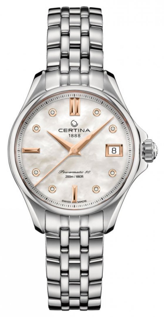 luxury watches Certina DS Action Diamonds, Automatic, 34.50 mm. The watch has functions date . Basic parameters of the watch are: dial colour is pearl, movement type is mechanical watch with automatic winding, strap material is steel and water resistance is 200 m.